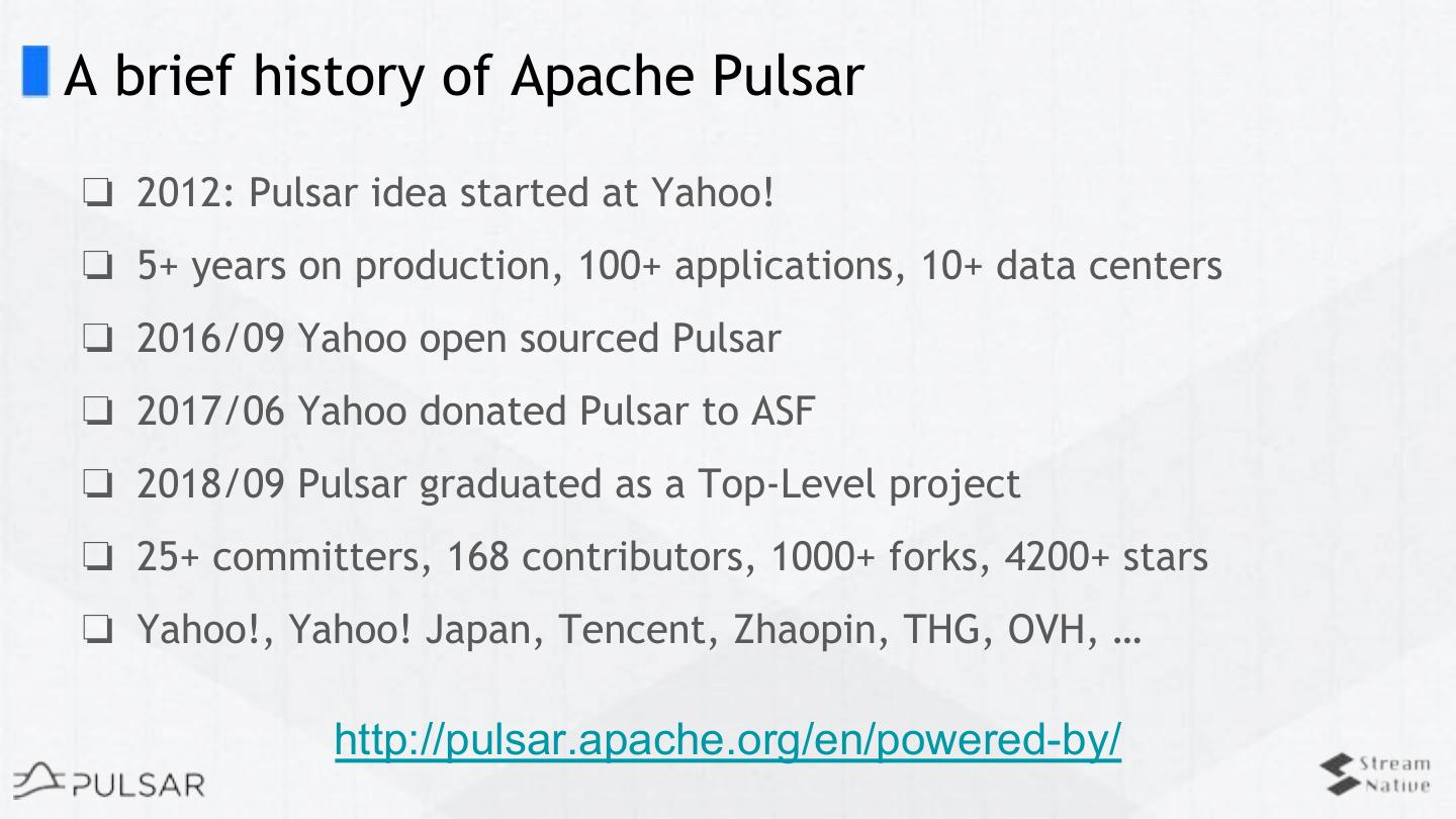 6 .A brief history of Apache Pulsar ❏ 2012: Pulsar idea started at Yahoo! ❏ 5+ years on production, 100+ applications, 10+ data centers ❏ 2016/09 Yahoo open sourced Pulsar ❏ 2017/06 Yahoo donated Pulsar to ASF ❏ 2018/09 Pulsar graduated as a Top-Level project ❏ 25+ committers, 168 contributors, 1000+ forks, 4200+ stars ❏ Yahoo!, Yahoo! Japan, Tencent, Zhaopin, THG, OVH, … http://pulsar.apache.org/en/powered-by/