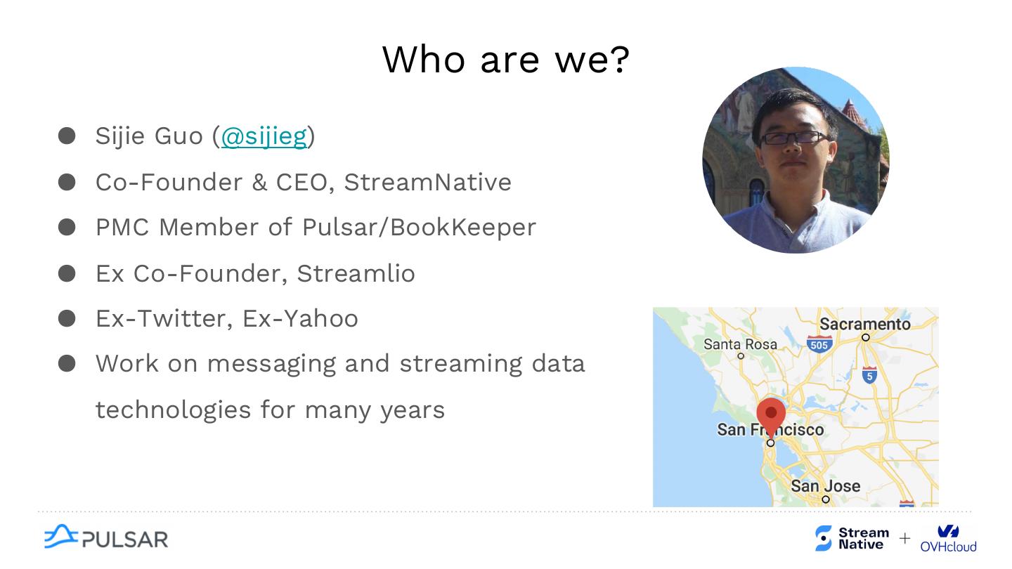 2 . Who are we? ● Sijie Guo (@sijieg) ● Co-Founder & CEO, StreamNative ● PMC Member of Pulsar/BookKeeper ● Ex Co-Founder, Streamlio ● Ex-Twitter, Ex-Yahoo ● Work on messaging and streaming data technologies for many years