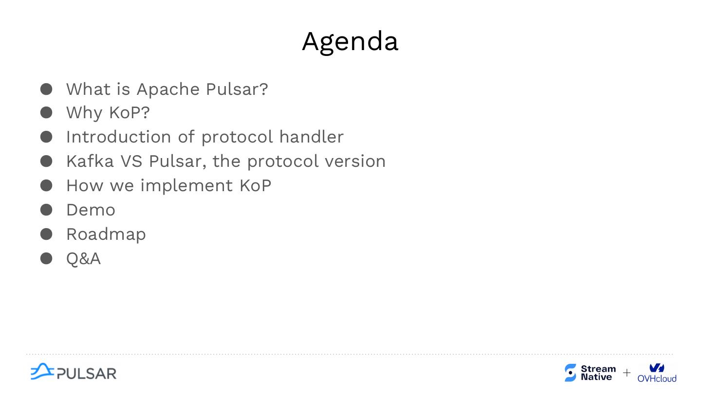 1 . Introducing Kafka-on-Pulsar: Bring native Kafka protocol support to Apache Pulsar Sijie Guo / Pierre Zemb Pulsar Summit 2020-06-17