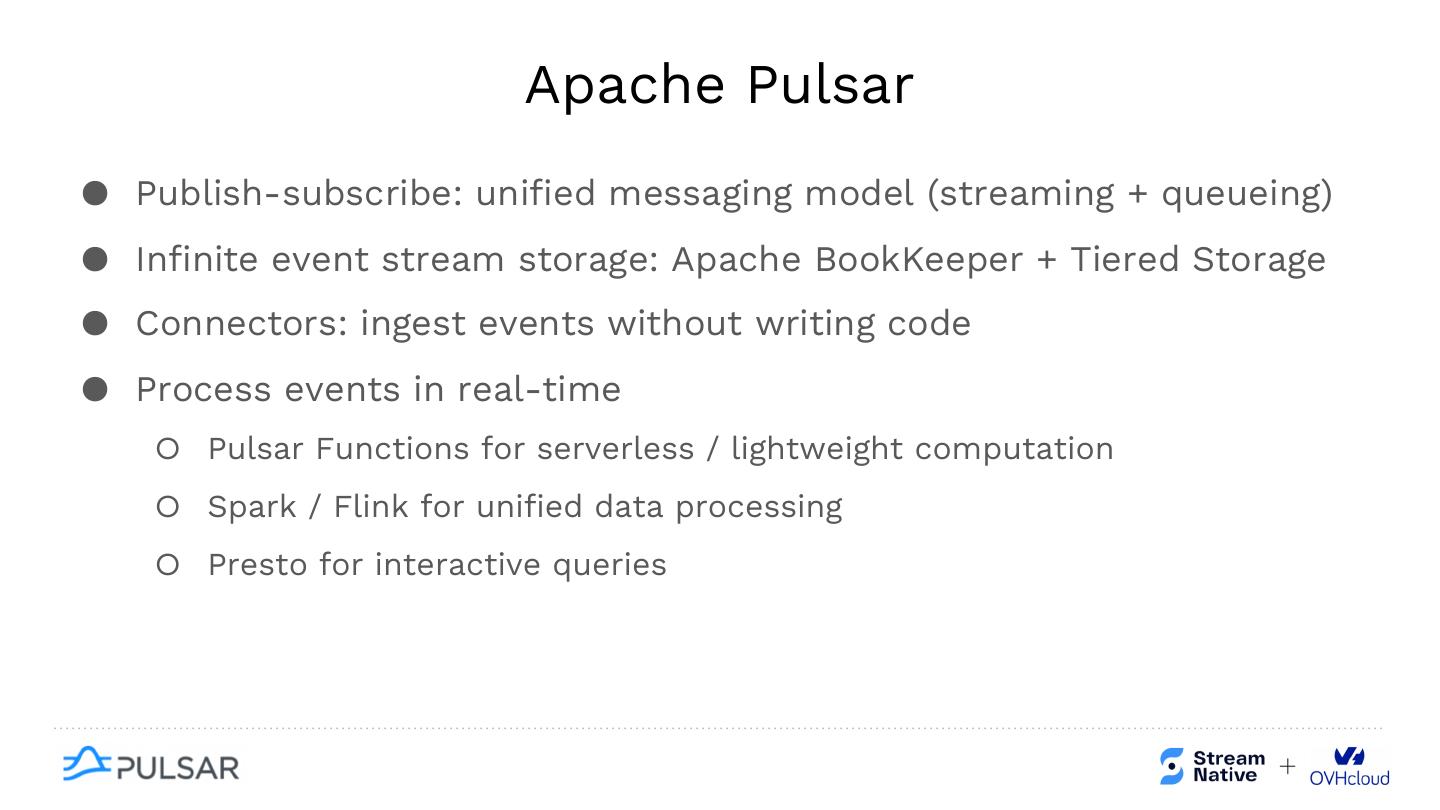 9 . Apache Pulsar ● Publish-subscribe: unified messaging model (streaming + queueing) ● Infinite event stream storage: Apache BookKeeper + Tiered Storage ● Connectors: ingest events without writing code ● Process events in real-time ○ Pulsar Functions for serverless / lightweight computation ○ Spark / Flink for unified data processing ○ Presto for interactive queries