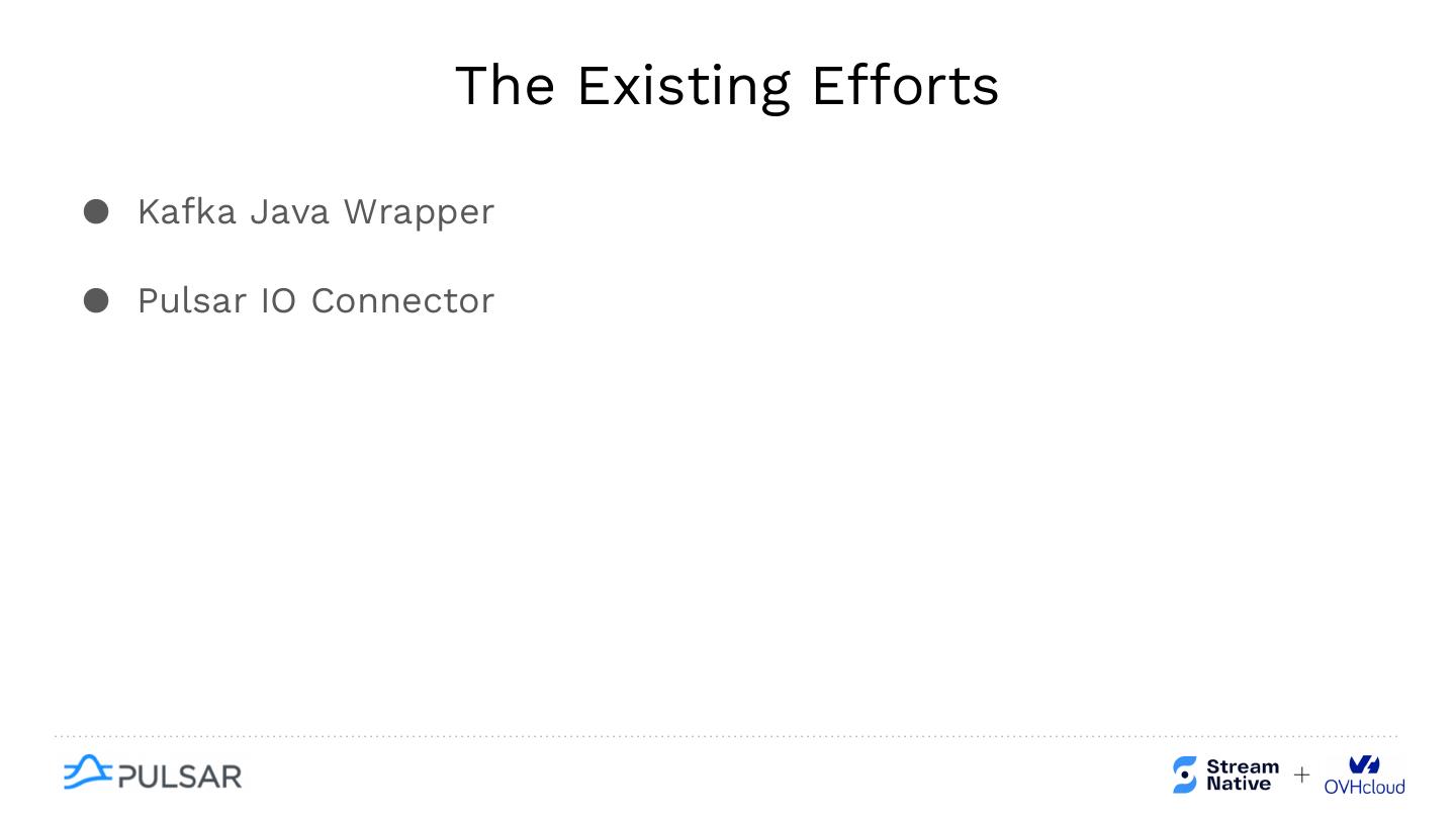 12 . The Existing Efforts ● Kafka Java Wrapper ● Pulsar IO Connector