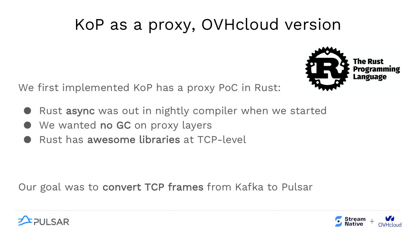 14 . KoP as a proxy, OVHcloud version We first implemented KoP has a proxy PoC in Rust: ● Rust async was out in nightly compiler when we started ● We wanted no GC on proxy layers ● Rust has awesome libraries at TCP-level Our goal was to convert TCP frames from Kafka to Pulsar
