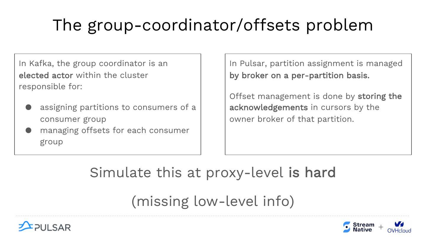 20 . The group-coordinator/offsets problem In Kafka, the group coordinator is an In Pulsar, partition assignment is managed elected actor within the cluster by broker on a per-partition basis. responsible for: Offset management is done by storing the ● assigning partitions to consumers of a acknowledgements in cursors by the consumer group owner broker of that partition. ● managing offsets for each consumer group Simulate this at proxy-level is hard (missing low-level info)