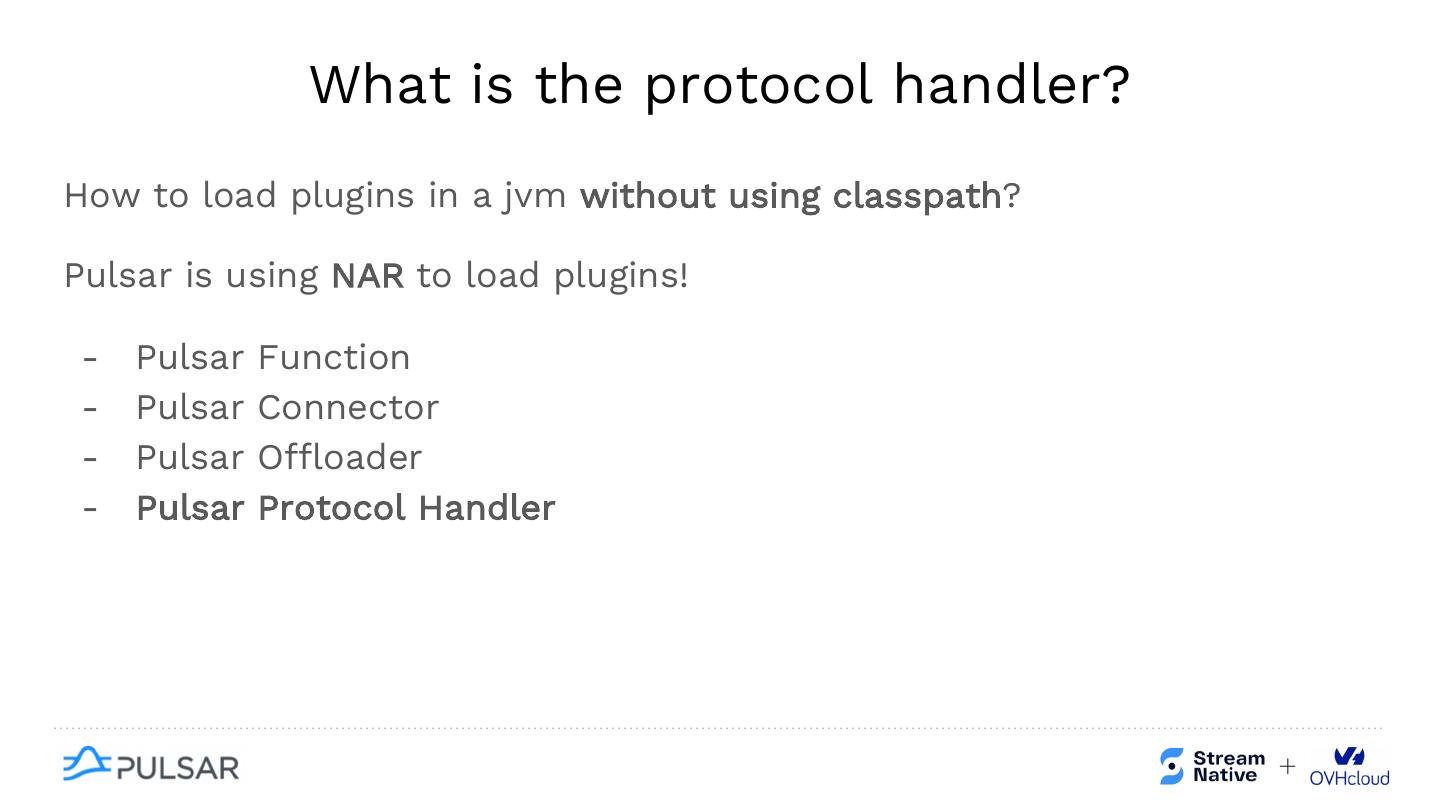 27 . What is the protocol handler? How to load plugins in a jvm without using classpath? Pulsar is using NAR to load plugins! - Pulsar Function - Pulsar Connector - Pulsar Offloader - Pulsar Protocol Handler
