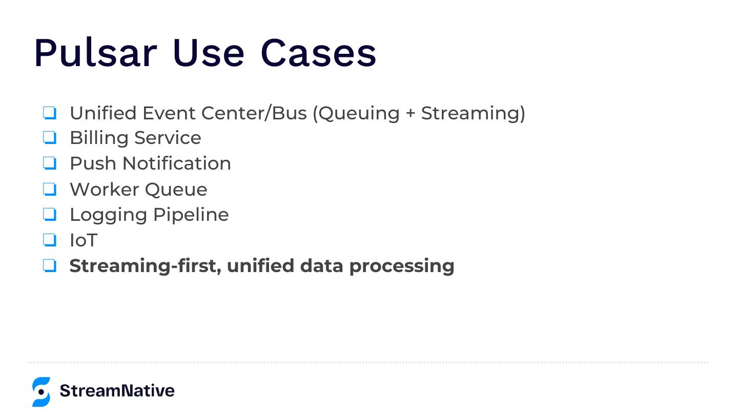 7 .Pulsar Use Cases ❏ Unified Event Center/Bus (Queuing + Streaming) ❏ Billing Service ❏ Push Notification ❏ Worker Queue ❏ Logging Pipeline ❏ IoT ❏ Streaming-first, unified data processing
