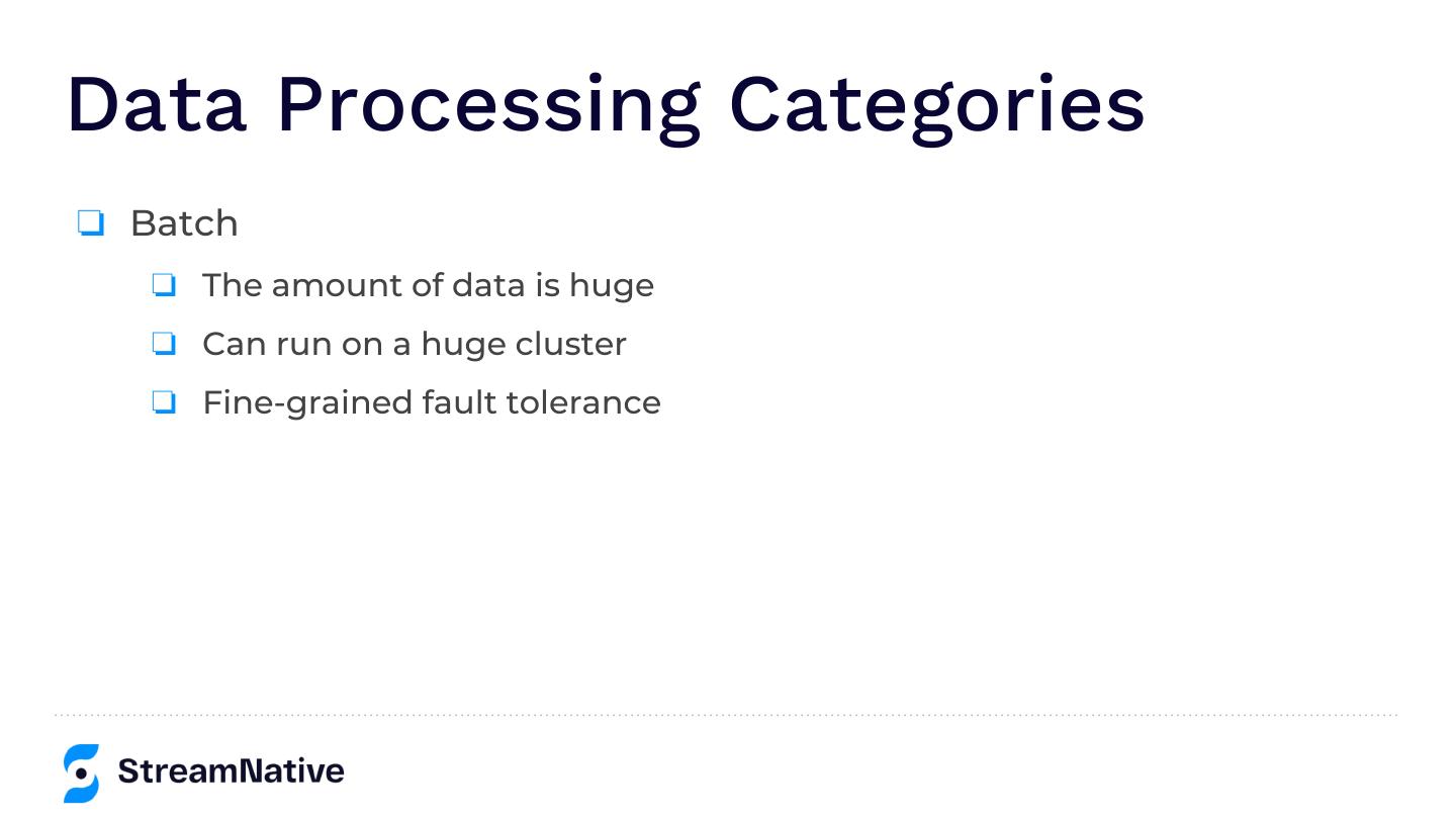 9 .Data Processing Categories ❏ Batch ❏ The amount of data is huge ❏ Can run on a huge cluster ❏ Fine-grained fault tolerance