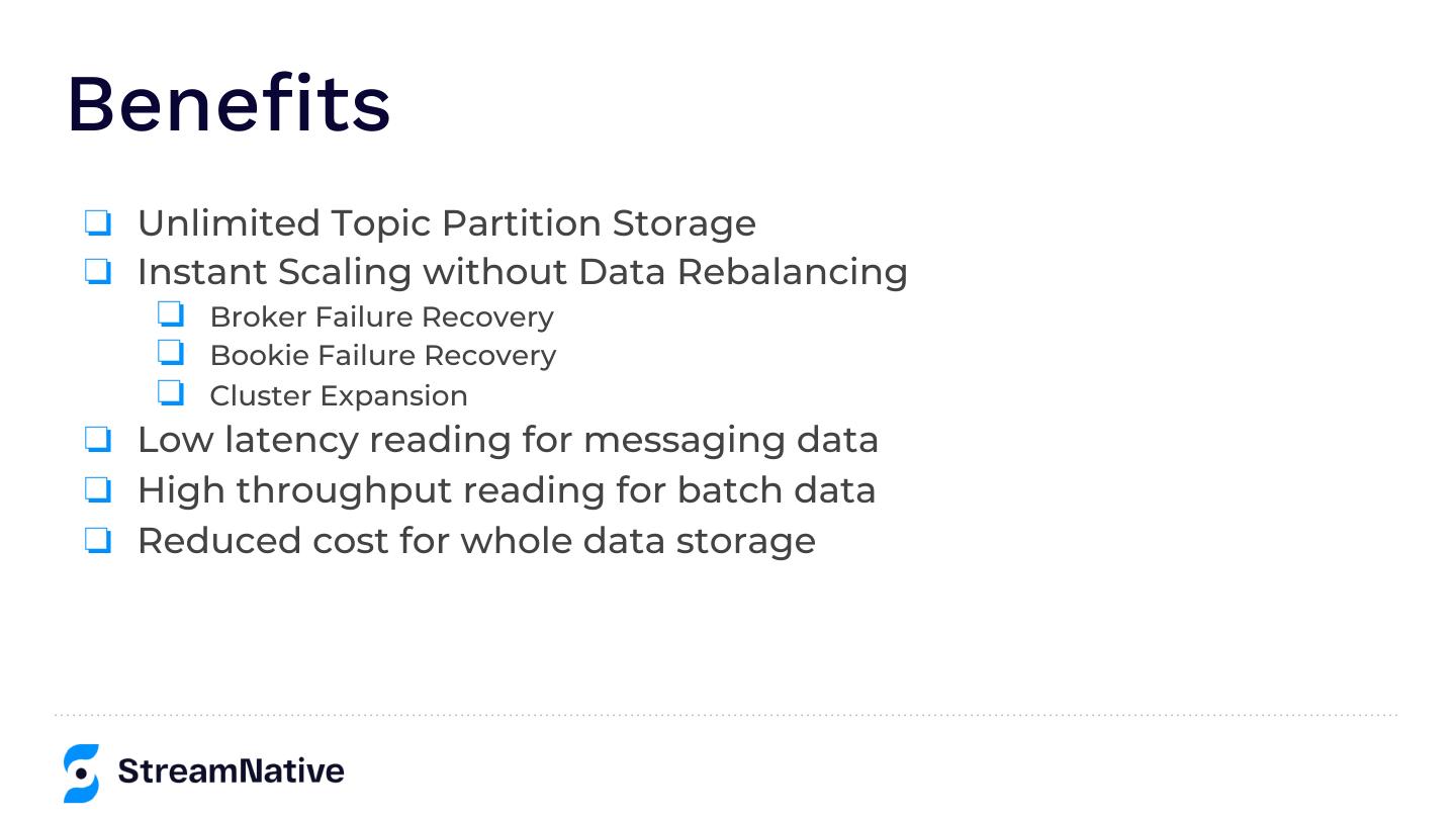 26 .Benefits ❏ Unlimited Topic Partition Storage ❏ Instant Scaling without Data Rebalancing ❏ Broker Failure Recovery ❏ Bookie Failure Recovery ❏ Cluster Expansion ❏ Low latency reading for messaging data ❏ High throughput reading for batch data ❏ Reduced cost for whole data storage