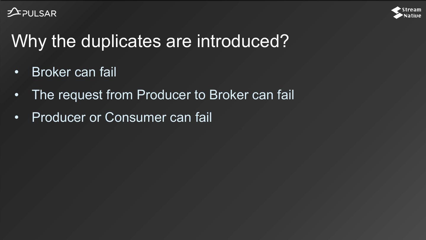 19 .Why the duplicates are introduced? • Broker can fail • The request from Producer to Broker can fail • Producer or Consumer can fail