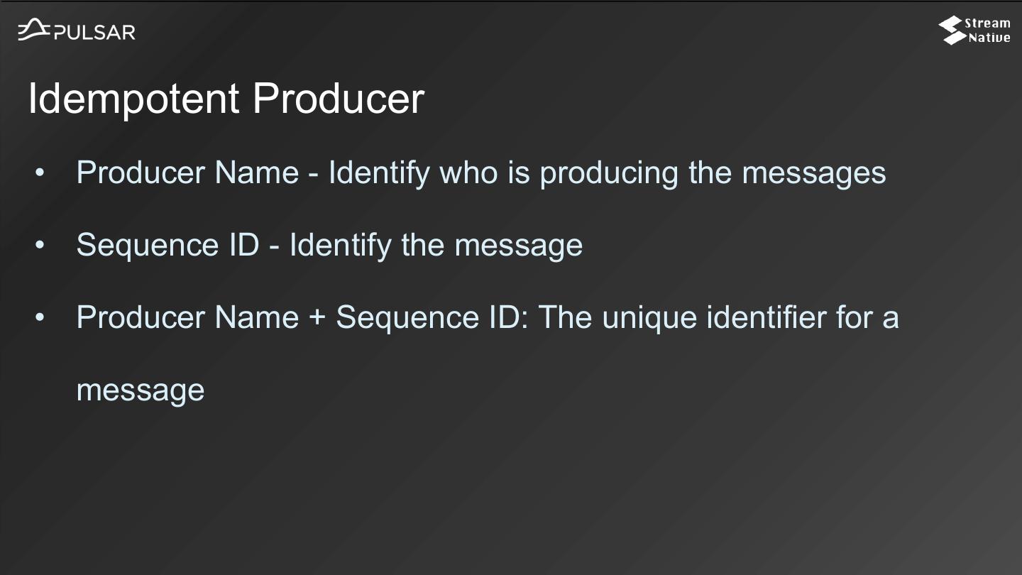 22 .Idempotent Producer • Producer Name - Identify who is producing the messages • Sequence ID - Identify the message • Producer Name + Sequence ID: The unique identifier for a message