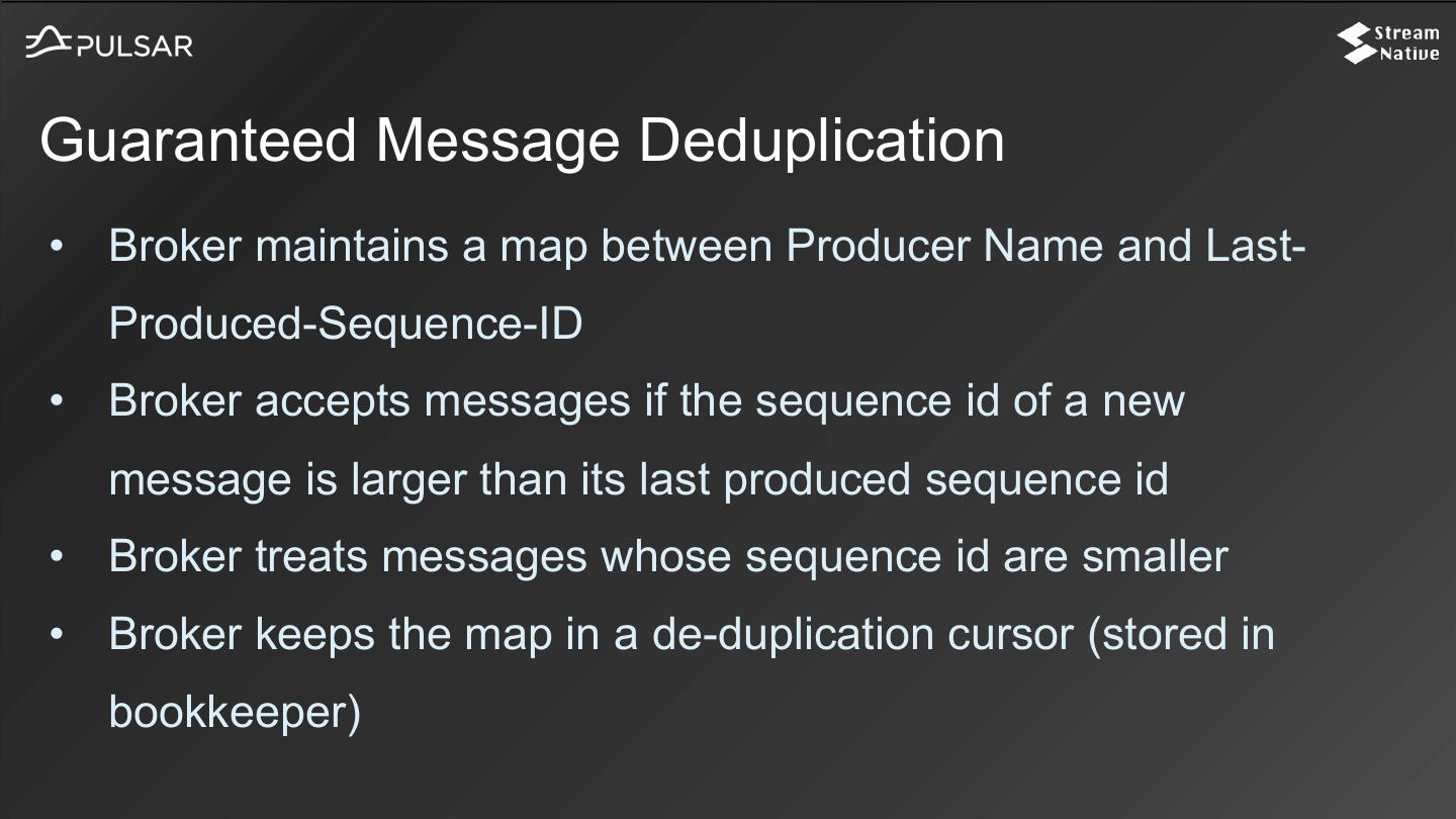 23 .Guaranteed Message Deduplication • Broker maintains a map between Producer Name and Last- Produced-Sequence-ID • Broker accepts messages if the sequence id of a new message is larger than its last produced sequence id • Broker treats messages whose sequence id are smaller • Broker keeps the map in a de-duplication cursor (stored in bookkeeper)
