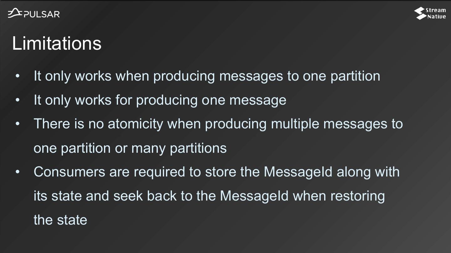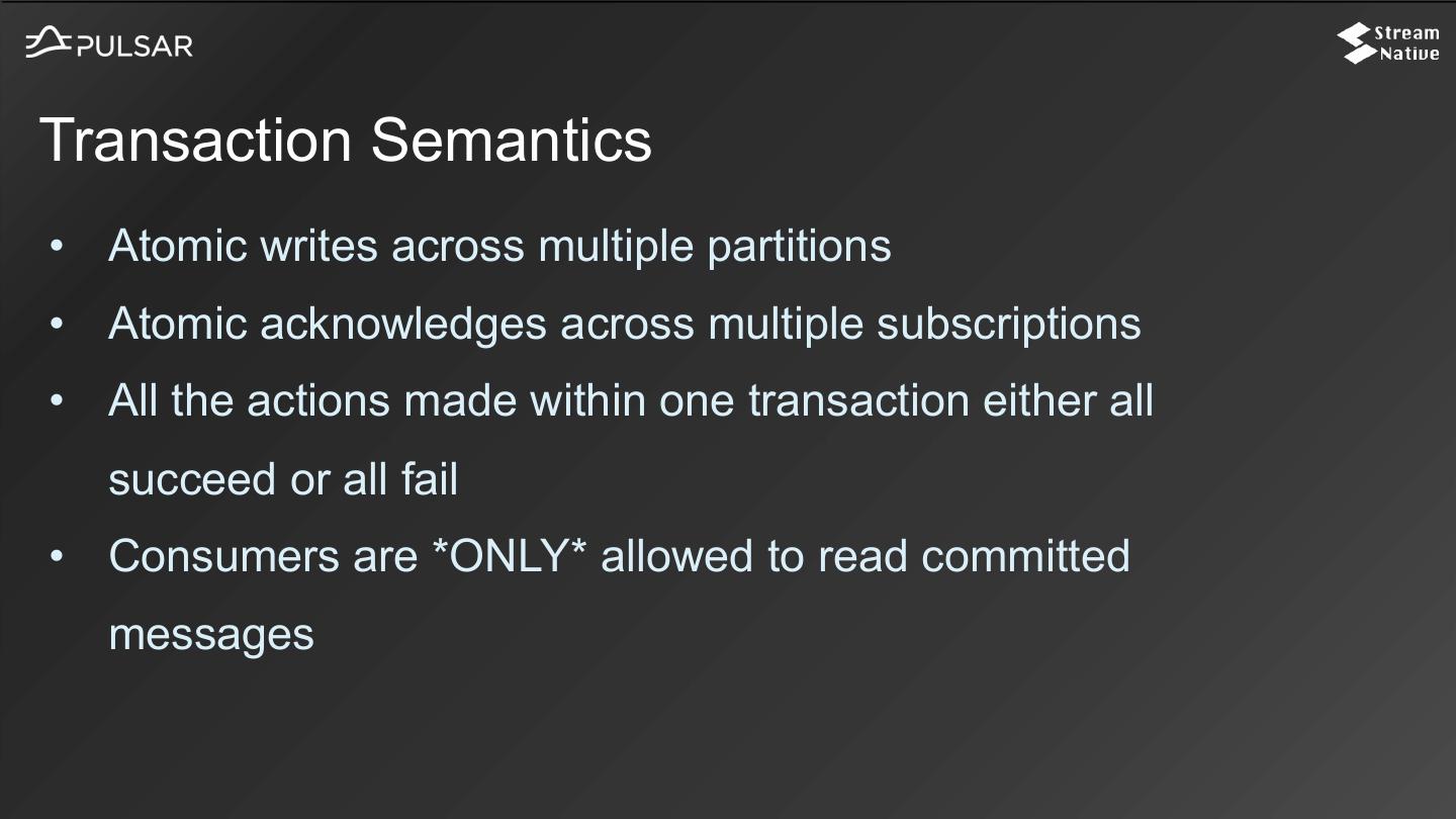 目前 Pulsar 通过 Idempotent Producer 支持在单个 partition 中的 exactly-once 语义。Idempotent Producer 保证 Producer 发送的消息在不丢失的情况下仅会被持久化一次。但是,当 Producer 发送消息到多个 partition 时,不能保证消息发送的原子性 。同样,Pulsar Functions 在处理多个事件或者输出一组结果到不同 topic partition 时,不能保证计算的原子性。PIP-31 通过增加对事务的支持来解决上述场景面临的问题。