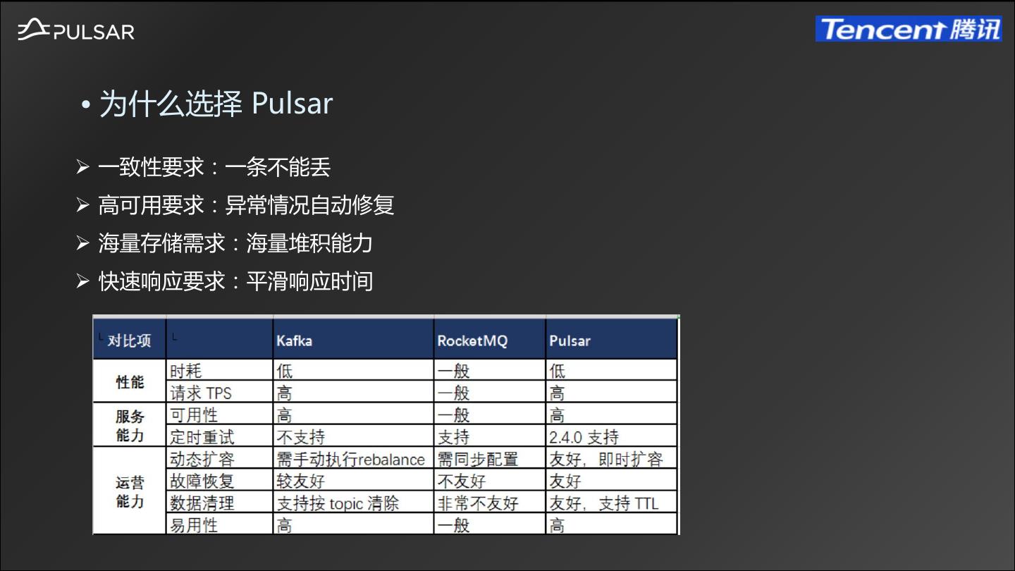 6 . Add your logo image • 为什么选择 Pulsar Ø 一致性要求:一条不能丢 Ø 高可用要求:异常情况自动修复 Ø 海量存储需求:海量堆积能力 Ø 快速响应要求:平滑响应时间