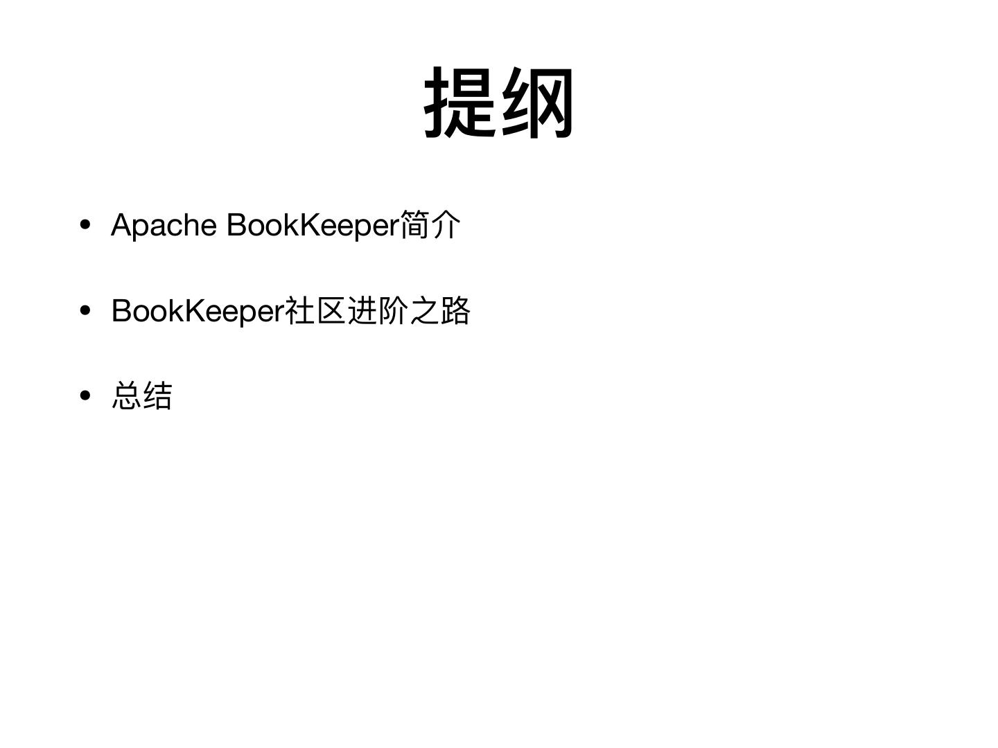 2 . 提纲 • Apache BookKeeper简介 • BookKeeper社区进阶之路路 • 总结