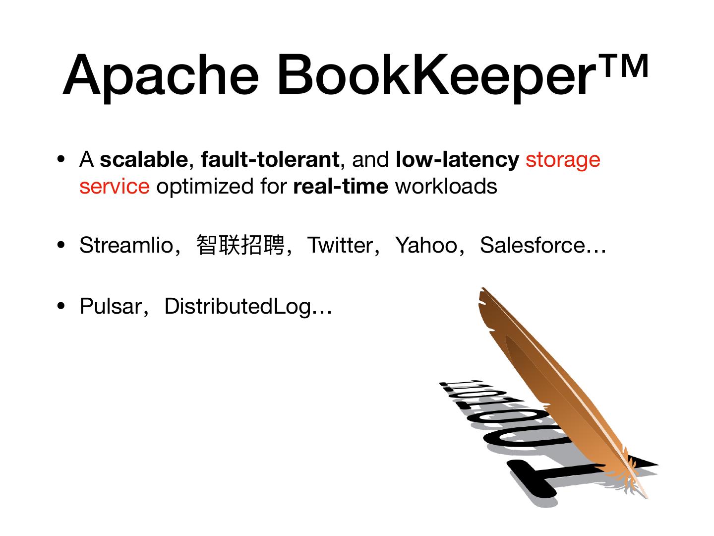 3 .Apache BookKeeper™ • A scalable, fault-tolerant, and low-latency storage service optimized for real-time workloads • Streamlio,智联招聘,Twitter,Yahoo,Salesforce… • Pulsar,DistributedLog…