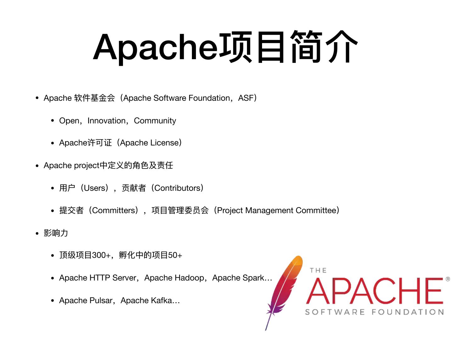 4 . Apache项⽬目简介 • Apache 软件基⾦金金会(Apache Software Foundation,ASF) • Open,Innovation,Community • Apache许可证(Apache License) • Apache project中定义的⻆角⾊色及责任 • ⽤用户(Users),贡献者(Contributors) • 提交者(Committers),项⽬目管理理委员会(Project Management Committee) • 影响⼒力力 • 顶级项⽬目300+,孵化中的项⽬目50+ • Apache HTTP Server,Apache Hadoop,Apache Spark… • Apache Pulsar,Apache Kafka…