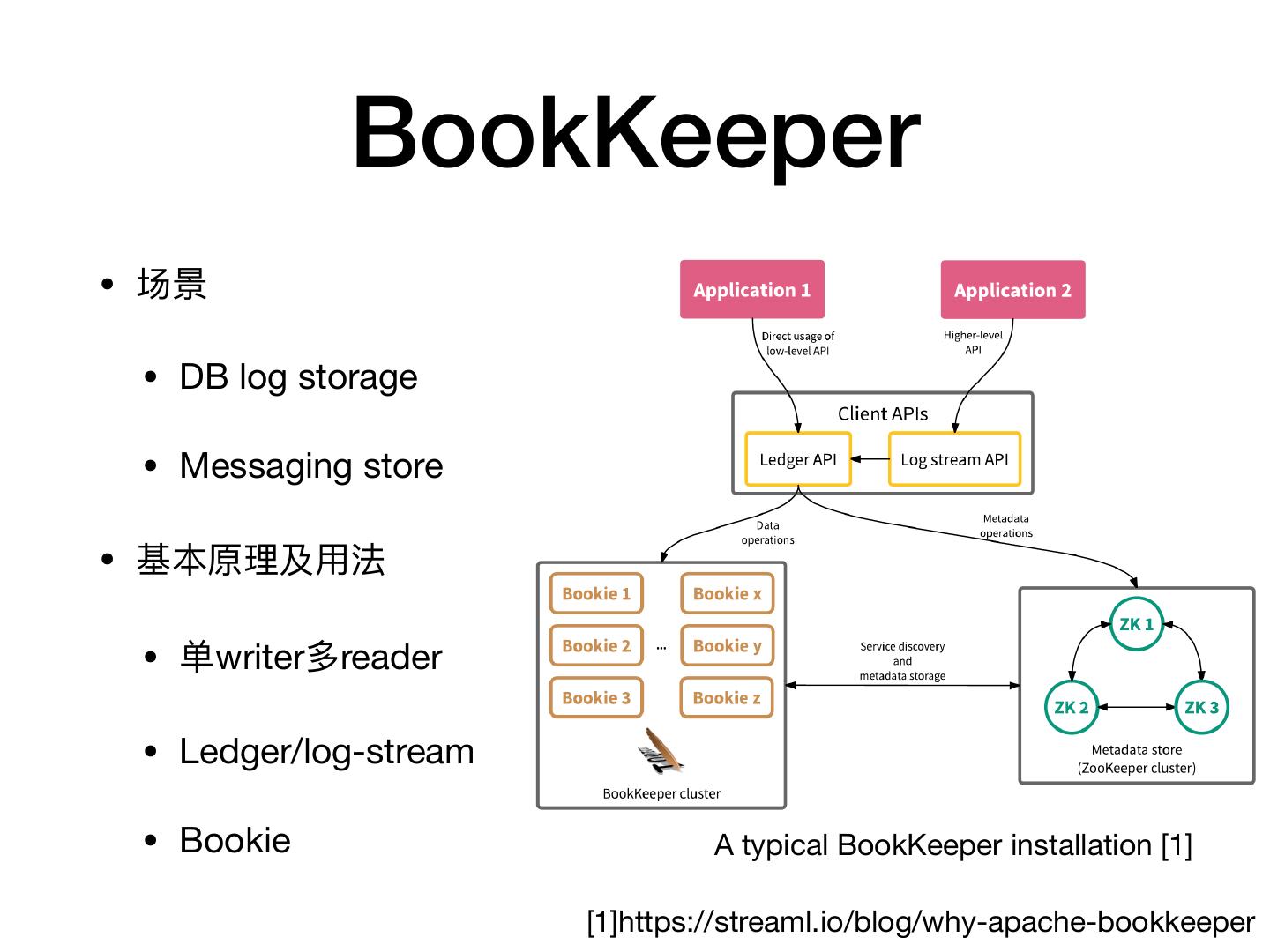 7 . BookKeeper • 场景 • DB log storage • Messaging store • 基本原理理及⽤用法 • 单writer多reader • Ledger/log-stream • Bookie A typical BookKeeper installation [1] [1]https://streaml.io/blog/why-apache-bookkeeper
