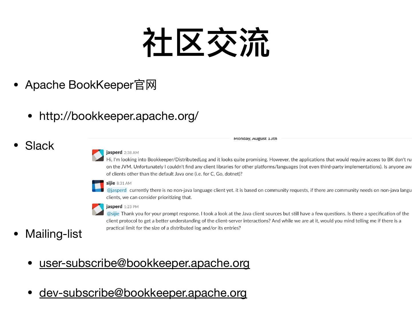 8 . 社区交流 • Apache BookKeeper官⽹网 • http://bookkeeper.apache.org/ • Slack • Mailing-list • user-subscribe@bookkeeper.apache.org • dev-subscribe@bookkeeper.apache.org