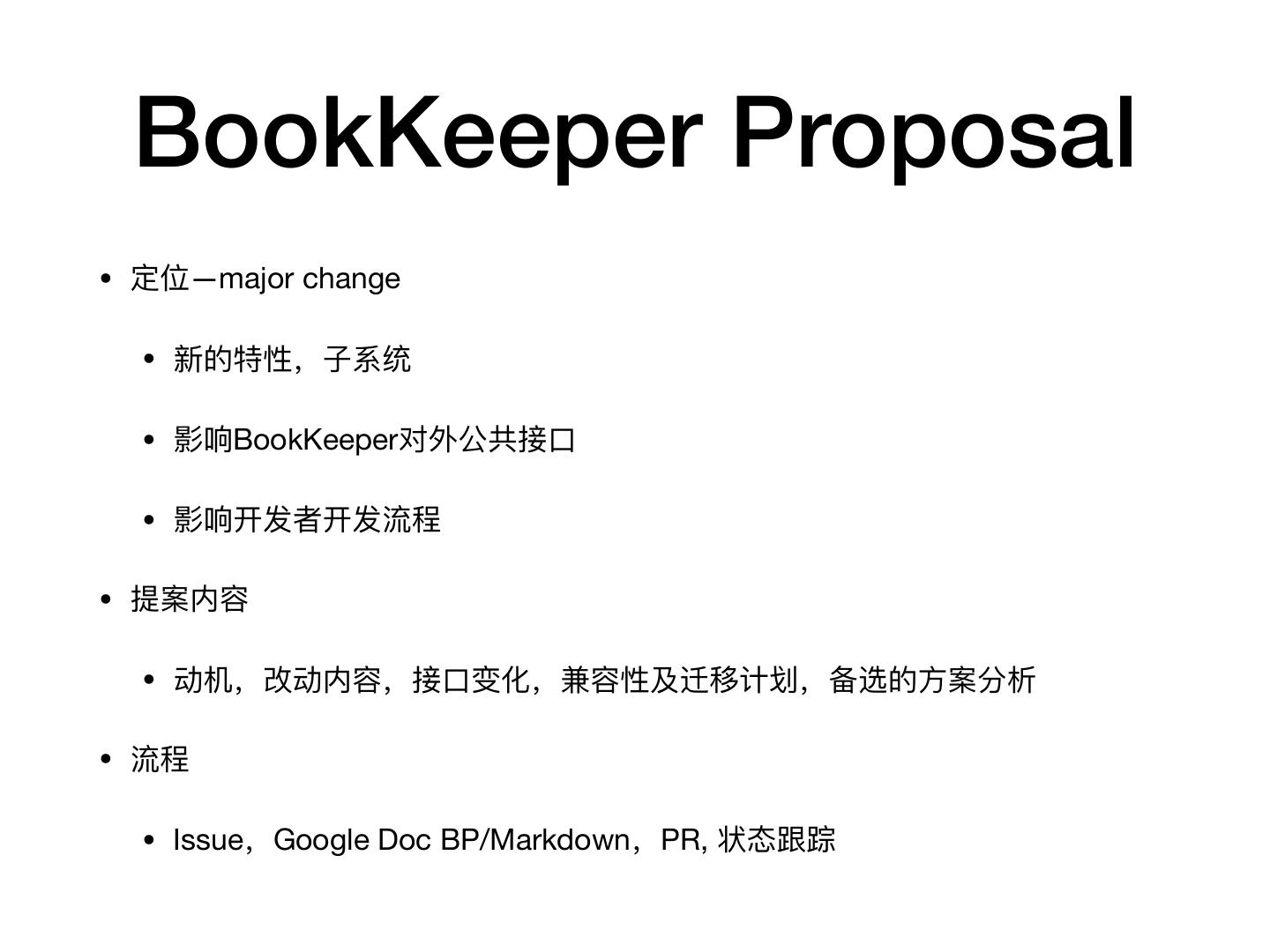 12 . BookKeeper Proposal • 定位—major change • 新的特性,⼦子系统 • 影响BookKeeper对外公共接⼝口 • 影响开发者开发流程 • 提案内容 • 动机,改动内容,接⼝口变化,兼容性及迁移计划,备选的⽅方案分析 • 流程 • Issue,Google Doc BP/Markdown,PR, 状态跟踪