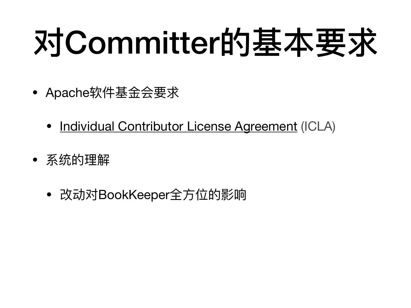 15 .对Committer的基本要求 • Apache软件基⾦金金会要求 • Individual Contributor License Agreement (ICLA) • 系统的理理解 • 改动对BookKeeper全⽅方位的影响
