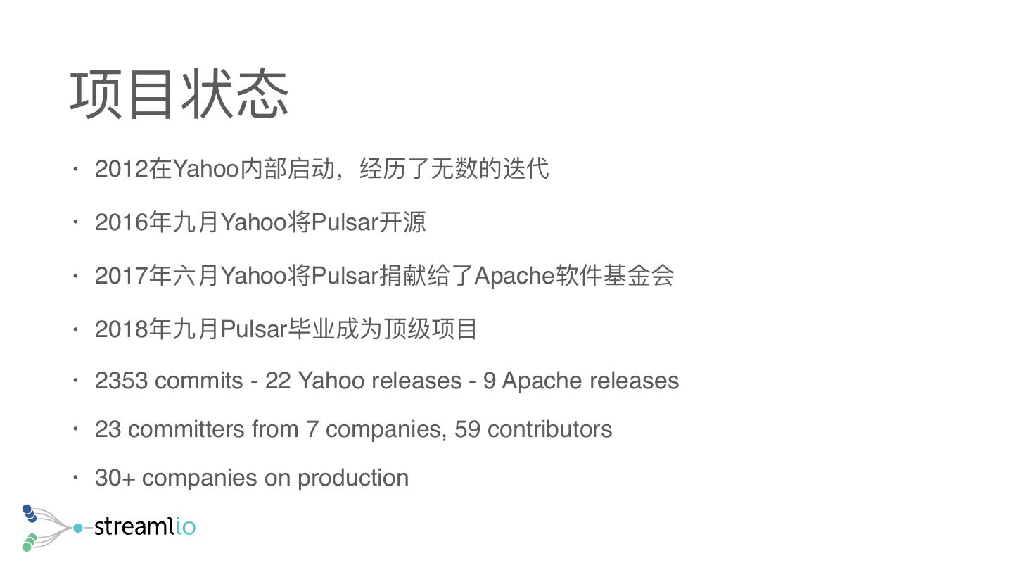10 .项⽬目状态 • 2012在Yahoo内部启动,经历了了⽆无数的迭代 • 2016年年九⽉月Yahoo将Pulsar开源 • 2017年年六⽉月Yahoo将Pulsar捐献给了了Apache软件基⾦金金会 • 2018年年九⽉月Pulsar毕业成为顶级项⽬目 • 2353 commits - 22 Yahoo releases - 9 Apache releases • 23 committers from 7 companies, 59 contributors • 30+ companies on production