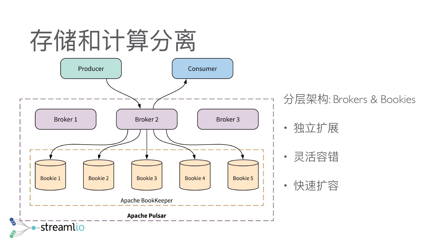 21 .存储和计算分离 分层架构: Brokers & Bookies • 独⽴立扩展 • 灵活容错 • 快速扩容