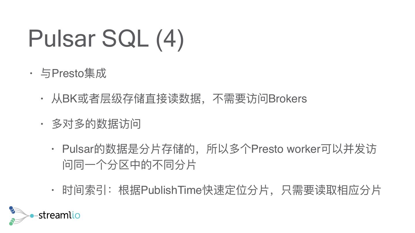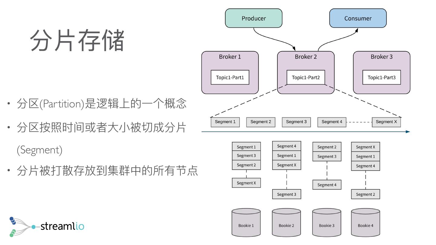 23 . 分区 vs 分⽚片 物理理分区 逻辑分区 Segment 1 Segment 2 Segment 3 Segment n Broker Broker Broker Broker Broker Broker 分区 存储和计算 紧耦合 分区 分布 (主副本) (拷⻉贝) (从拷⻉贝) 分离 Segment 1 Segment 2 Segment 3 Segment 1 Segment 2 Segment 3 Segment 1 Segment 2 . . . . . . . . Segment n Segment n Segment n Segment n 分区架构 ! 物理理分区 分⽚片架构 ! 存储和计算紧耦合 ! 容错恢复需要拷⻉贝物理理分区 ! 逻辑分区,“物理理”分⽚片 ! 扩容需要迁移物理理分区来达到负载均衡 ! 存储和计算分离 ! 失效处理理相互分离,快速、⽆无痛点 ! 弹性扩容