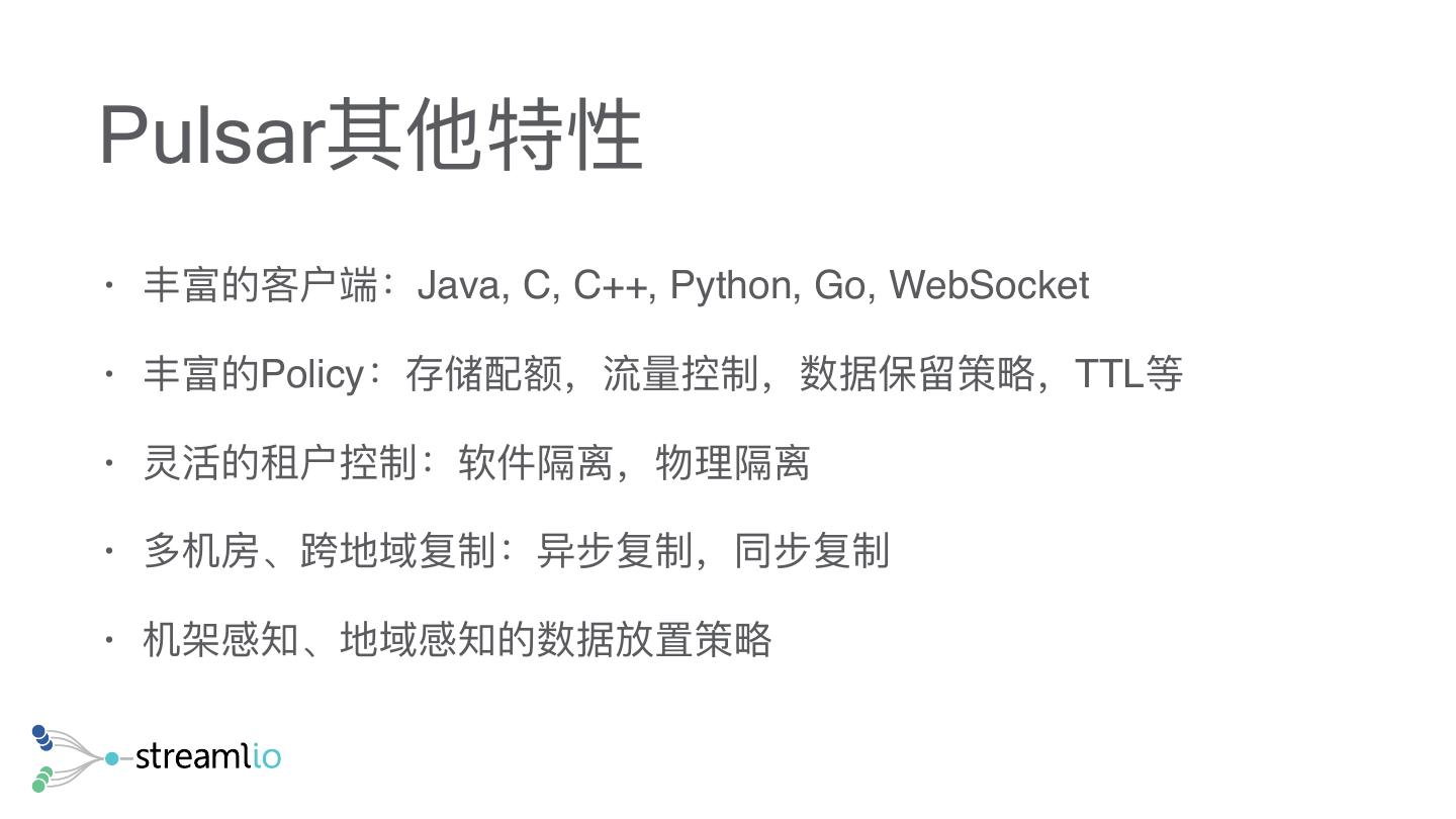 29 .Pulsar其他特性 • 丰富的客户端:Java, C, C++, Python, Go, WebSocket • 丰富的Policy:存储配额,流量量控制,数据保留留策略略,TTL等 • 灵活的租户控制:软件隔离,物理理隔离 • 多机房、跨地域复制:异步复制,同步复制 • 机架感知、地域感知的数据放置策略略