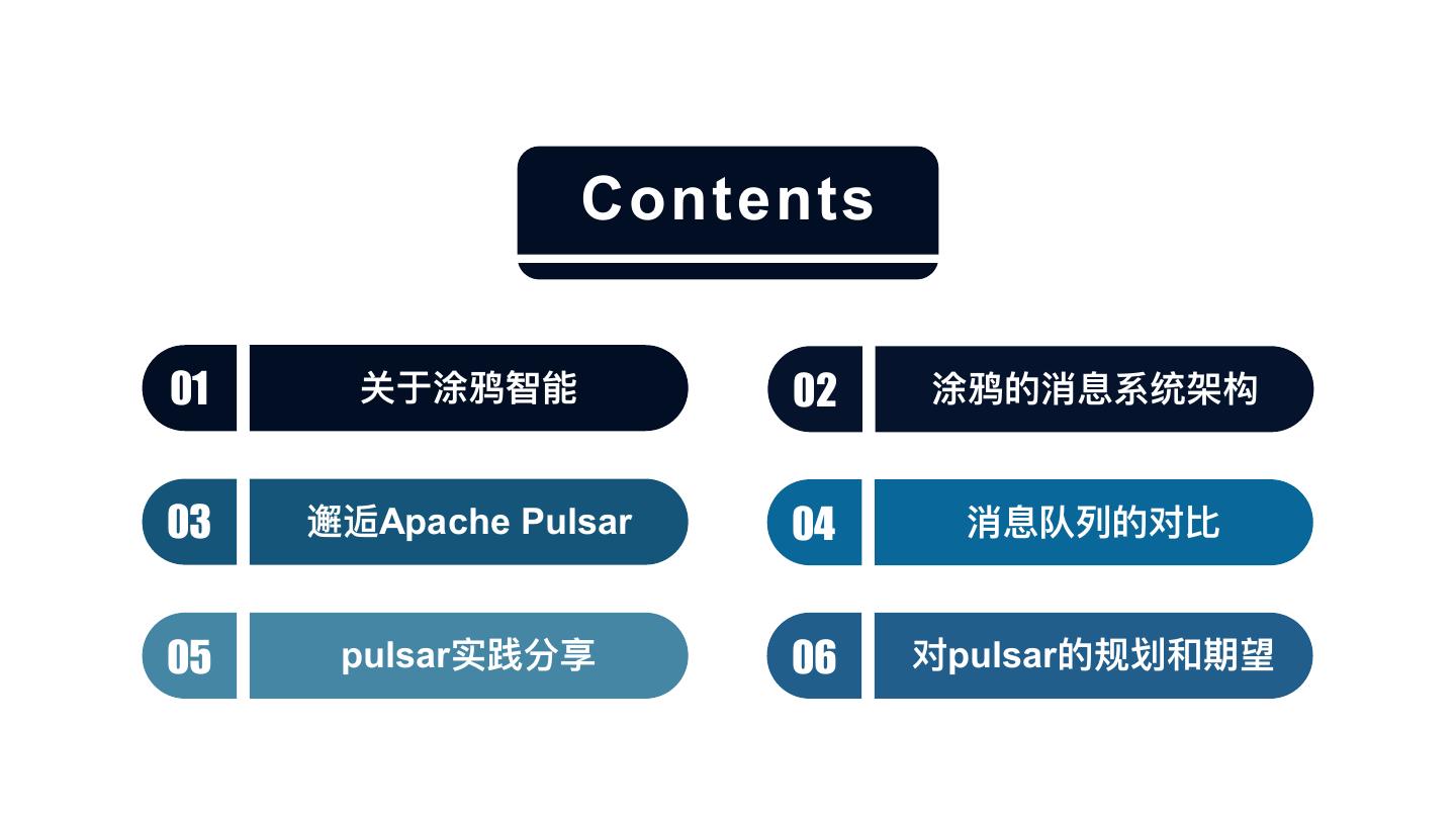 2 . Contents 01 关于涂鸦智能 02 涂鸦的消息系统架构 03 邂逅Apache Pulsar 04 消息队列的对⽐ 05 pulsar实践分享 06 对pulsar的规划和期望