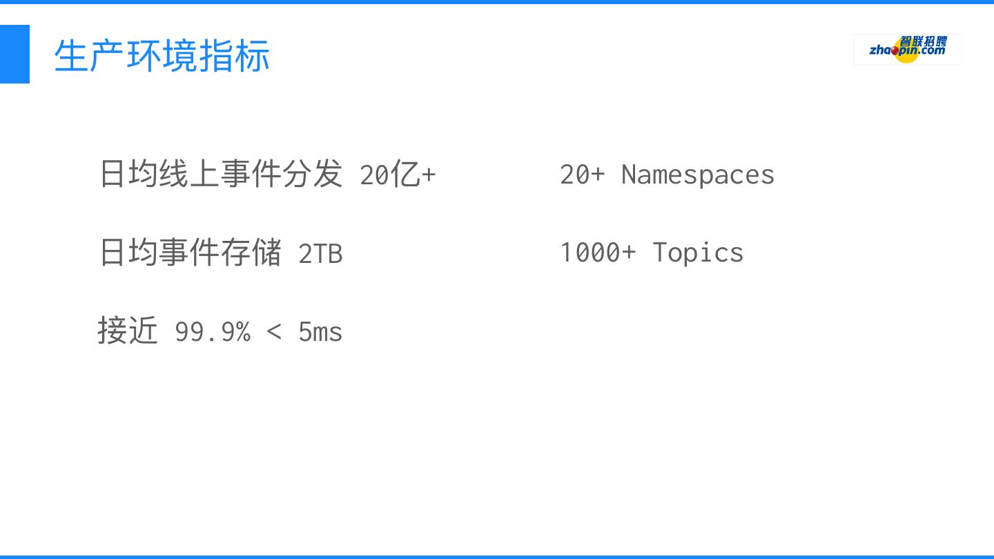 5 .⽣生产环境指标 ⽇日均线上事件分发 20亿+ 20+ Namespaces ⽇日均事件存储 2TB 1000+ Topics 接近 99.9% < 5ms