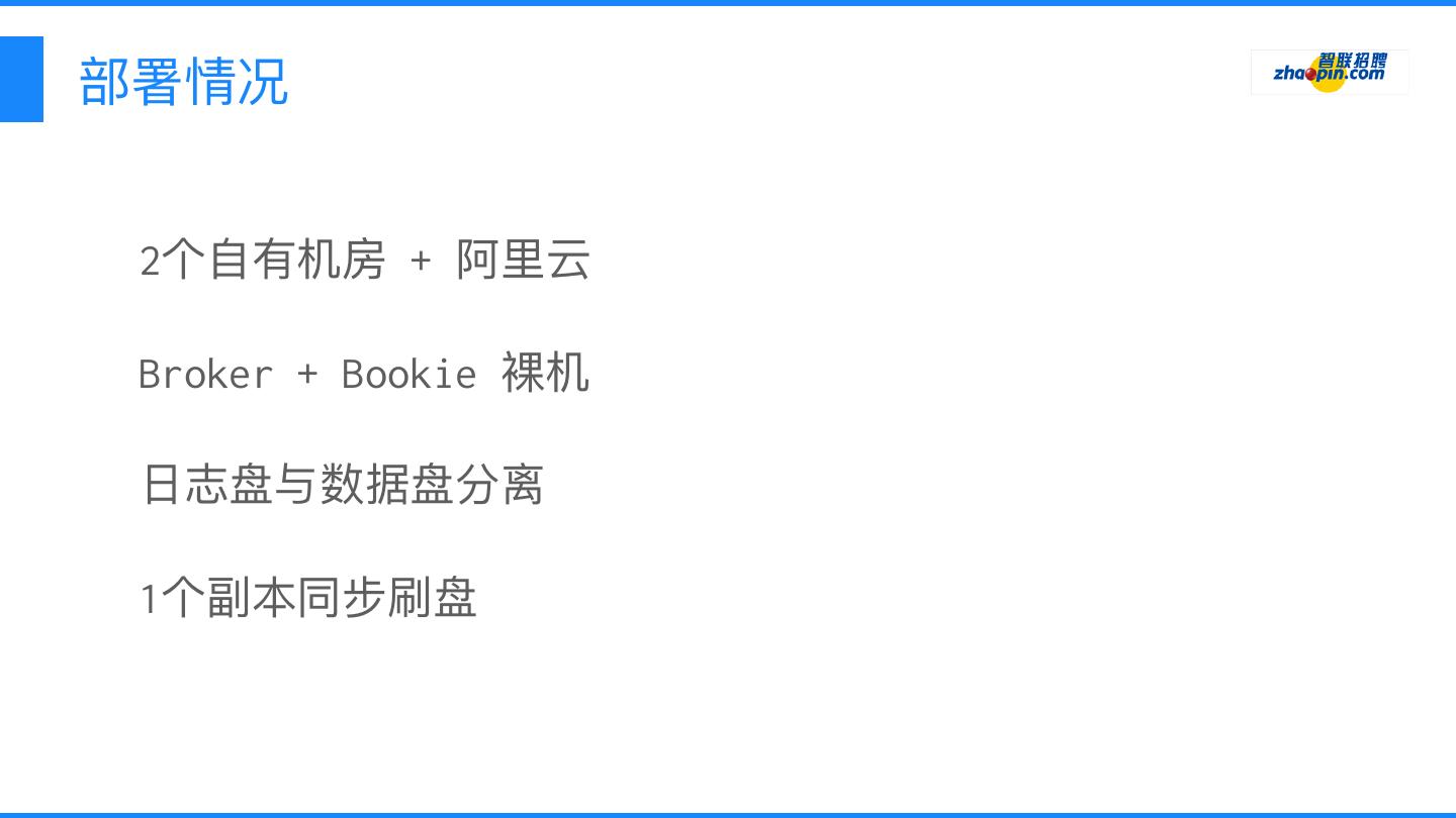 13 .部署情况 2个⾃自有机房 + 阿⾥里里云 Broker + Bookie 裸机 ⽇日志盘与数据盘分离 1个副本同步刷盘