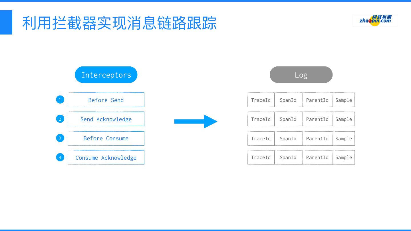 15 .利利⽤用拦截器器实现消息链路路跟踪 Interceptors Log 1 Before Send TraceId SpanId ParentId Sample 2 Send Acknowledge TraceId SpanId ParentId Sample 3 Before Consume TraceId SpanId ParentId Sample 4 Consume Acknowledge TraceId SpanId ParentId Sample