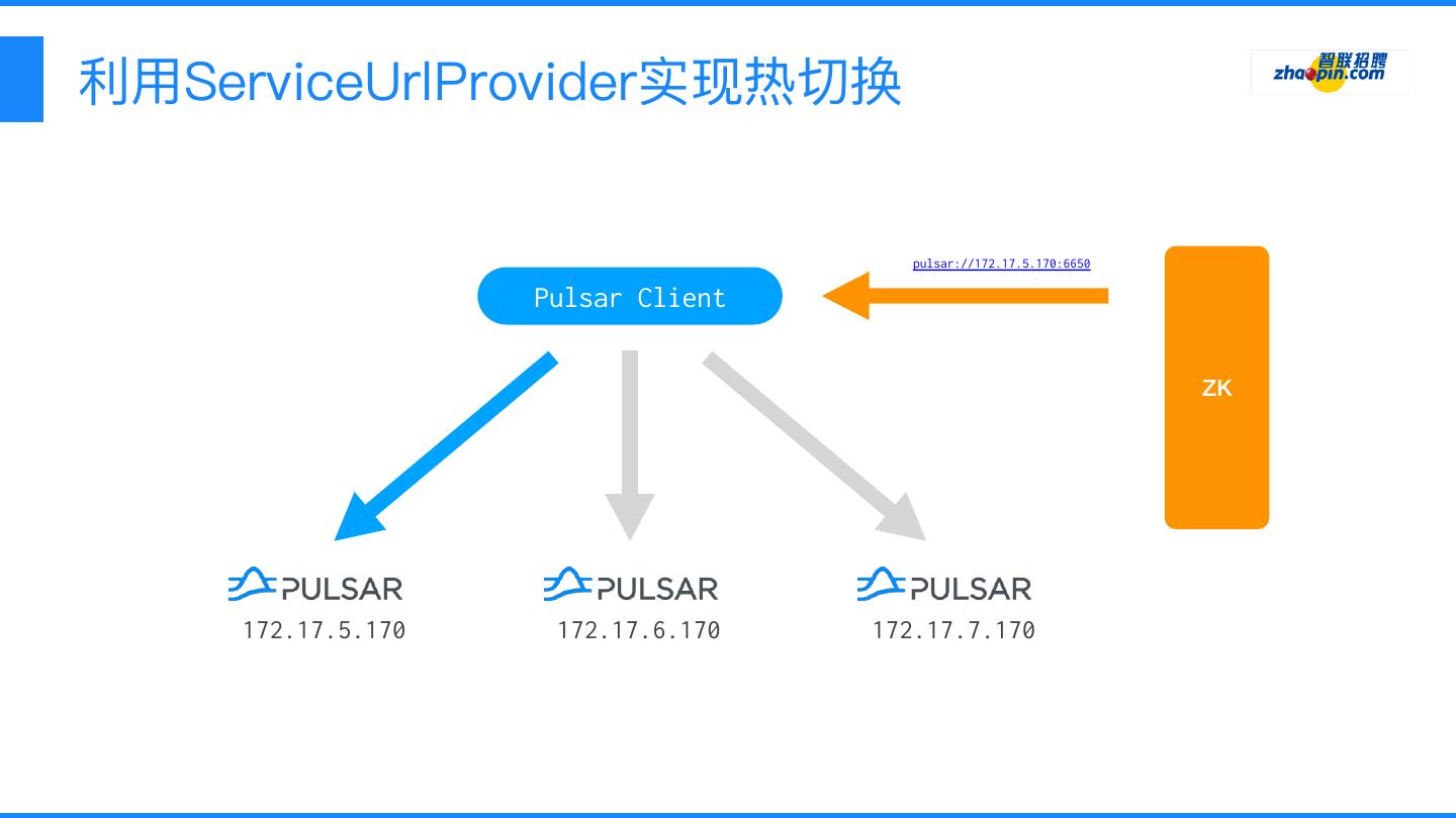 17 .利利⽤用ServiceUrlProvider实现热切换 pulsar://172.17.6.170:6650 Pulsar Client ZK 172.17.5.170 172.17.6.170 172.17.7.170