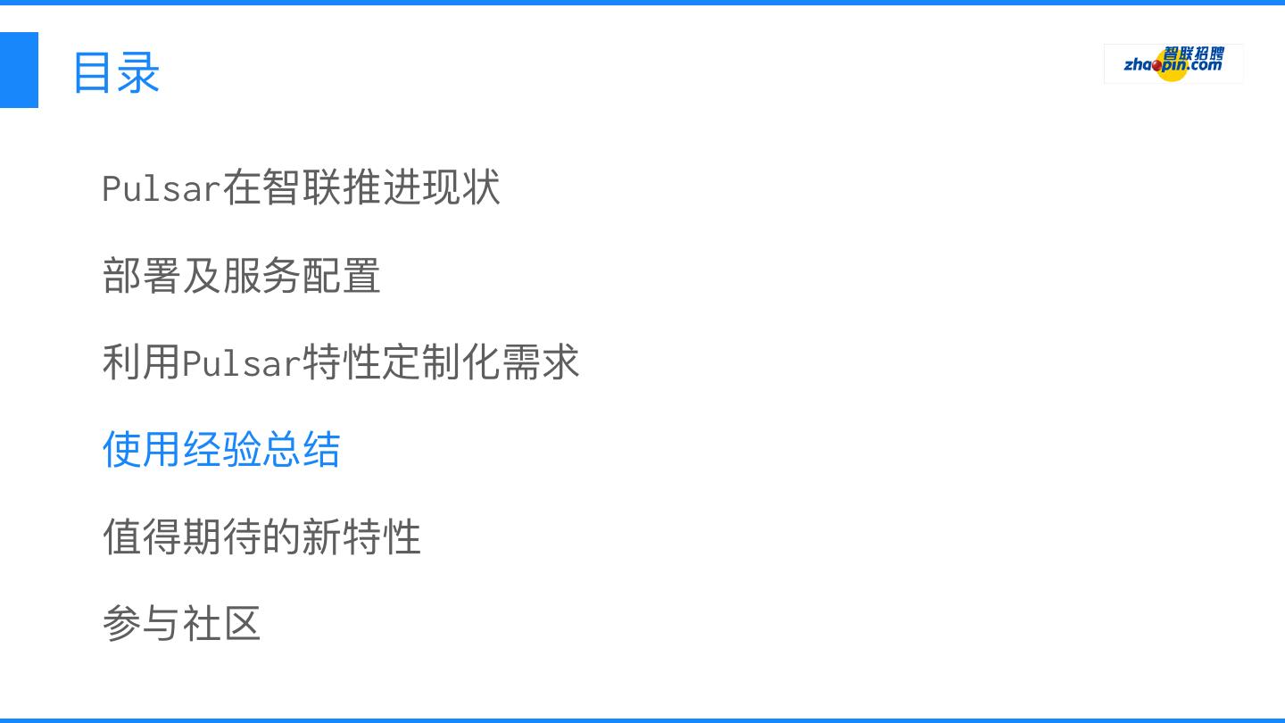 3 .⽬目录 Pulsar在智联的现状 部署及服务配置 利利⽤用Pulsar特性定制化需求 使⽤用经验总结 值得期待的新特性 参与社区