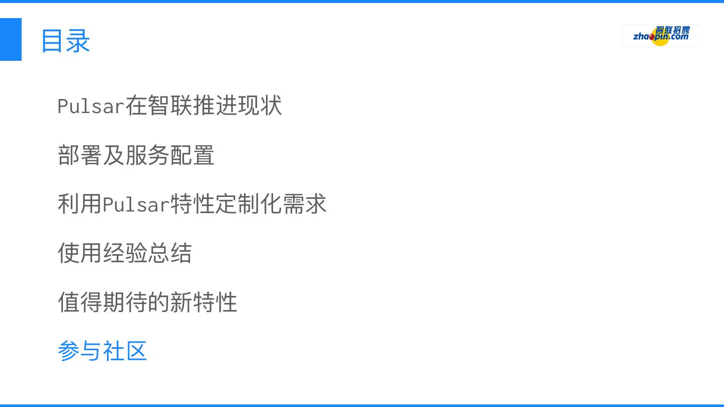 20 .⽬目录 Pulsar在智联推进现状 部署及服务配置 利利⽤用Pulsar特性定制化需求 使⽤用经验总结 值得期待的新特性 参与社区