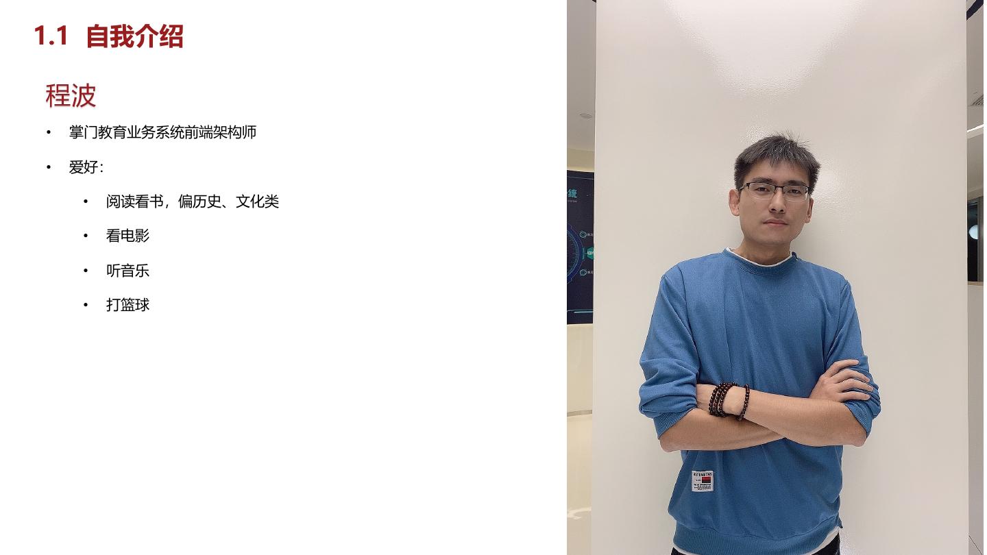 4 .1.1 自我介绍 • 掌门教育业务系统前端架构师 • 爱好: • 阅读看书,偏历史、文化类 • 看电影 • 听音乐 • 打篮球
