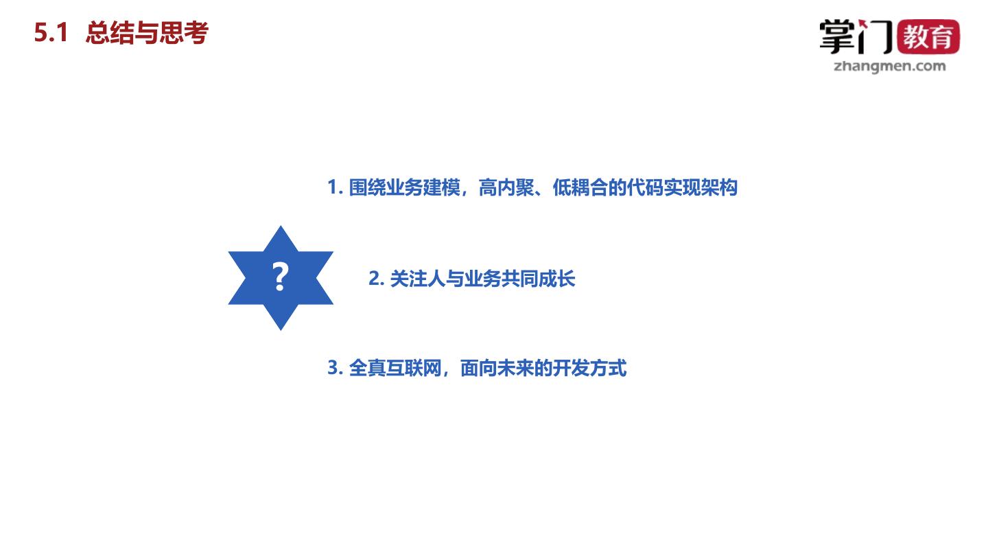 14 .5.1 总结与思考 1. 围绕业务建模,高内聚、低耦合的代码实现架构 ? 2. 关注人与业务共同成长 3. 全真互联网,面向未来的开发方式