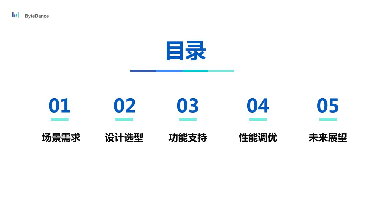 2 .ByteDance 目录 01 02 03 04 05 场景需求 设计选型 功能支持 性能调优 未来展望