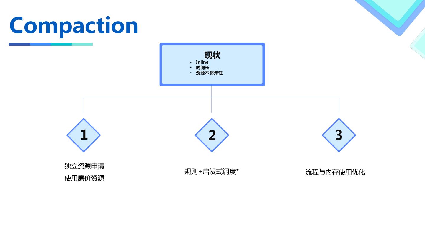 13 .Compaction 现状 • Inline • 时间长 • 资源不够弹性 1 2 3 独立资源申请 规则+启发式调度* 流程与内存使用优化 使用廉价资源