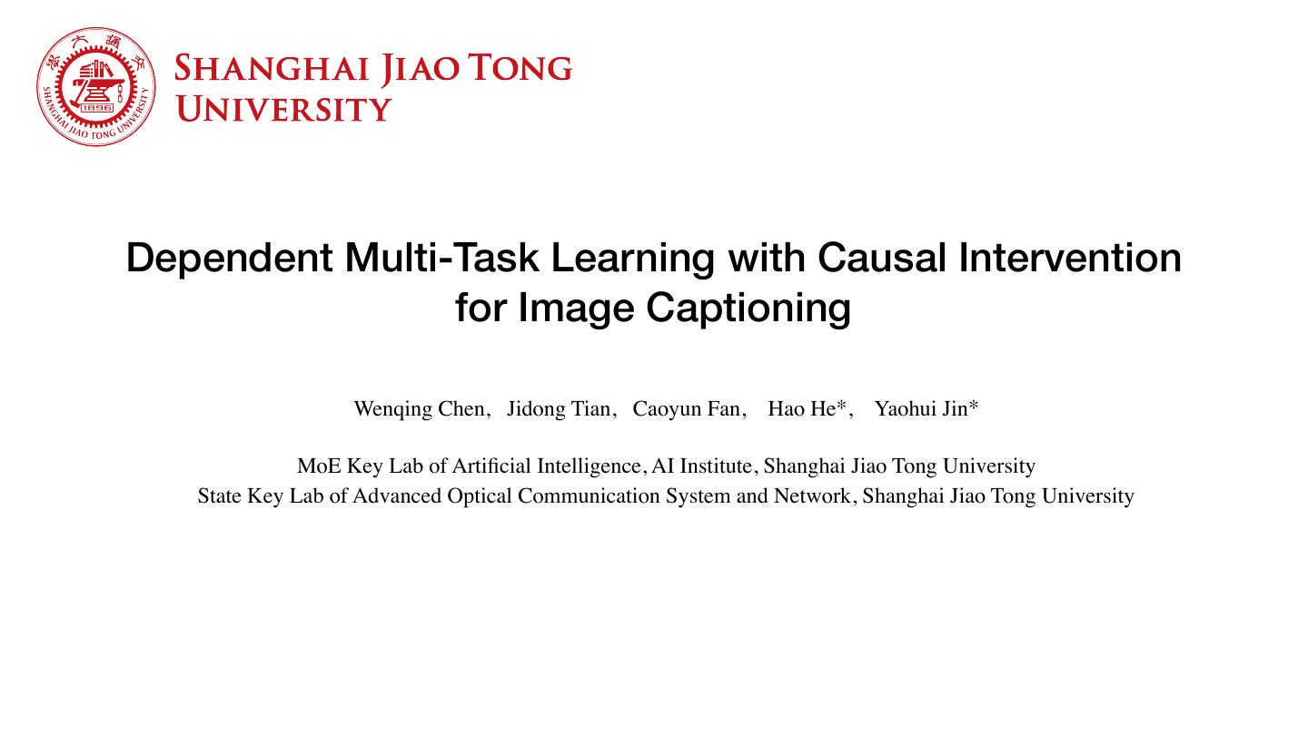 2 .Dependent Multi-Task Learning with Causal Intervention for Image Captioning Wenqing Chen, Jidong Tian, Caoyun Fan, Hao He∗, Yaohui Jin∗ MoE Key Lab of Artificial Intelligence, AI Institute, Shanghai Jiao Tong University State Key Lab of Advanced Optical Communication System and Network, Shanghai Jiao Tong University