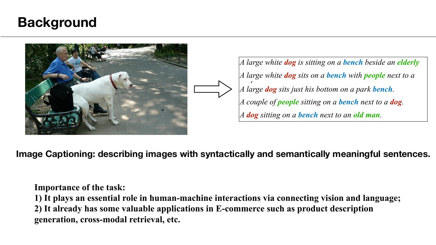 3 .Background A large white dog is sitting on a bench beside an elderly man. A large white dog sits on a bench with people next to a path. A large dog sits just his bottom on a park bench. A couple of people sitting on a bench next to a dog. A dog sitting on a bench next to an old man. Image Captioning: describing images with syntactically and semantically meaningful sentences. Importance of the task: 1) It plays an essential role in human-machine interactions via connecting vision and language; 2) It already has some valuable applications in E-commerce such as product description generation, cross-modal retrieval, etc.