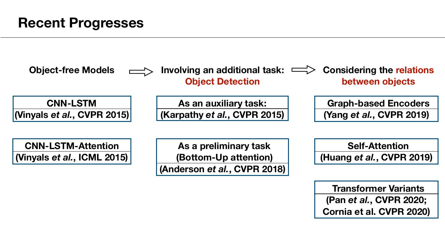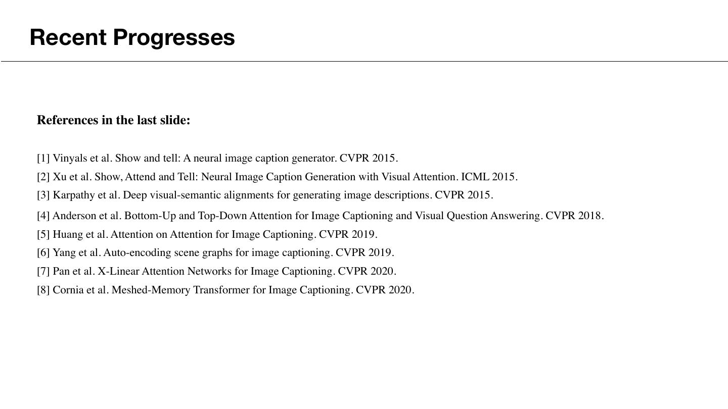 5 .Recent Progresses References in the last slide: [1] Vinyals et al. Show and tell: A neural image caption generator. CVPR 2015. [2] Xu et al. Show, Attend and Tell: Neural Image Caption Generation with Visual Attention. ICML 2015. [3] Karpathy et al. Deep visual-semantic alignments for generating image descriptions. CVPR 2015. [4] Anderson et al. Bottom-Up and Top-Down Attention for Image Captioning and Visual Question Answering. CVPR 2018. [5] Huang et al. Attention on Attention for Image Captioning. CVPR 2019. [6] Yang et al. Auto-encoding scene graphs for image captioning. CVPR 2019. [7] Pan et al. X-Linear Attention Networks for Image Captioning. CVPR 2020. [8] Cornia et al. Meshed-Memory Transformer for Image Captioning. CVPR 2020.