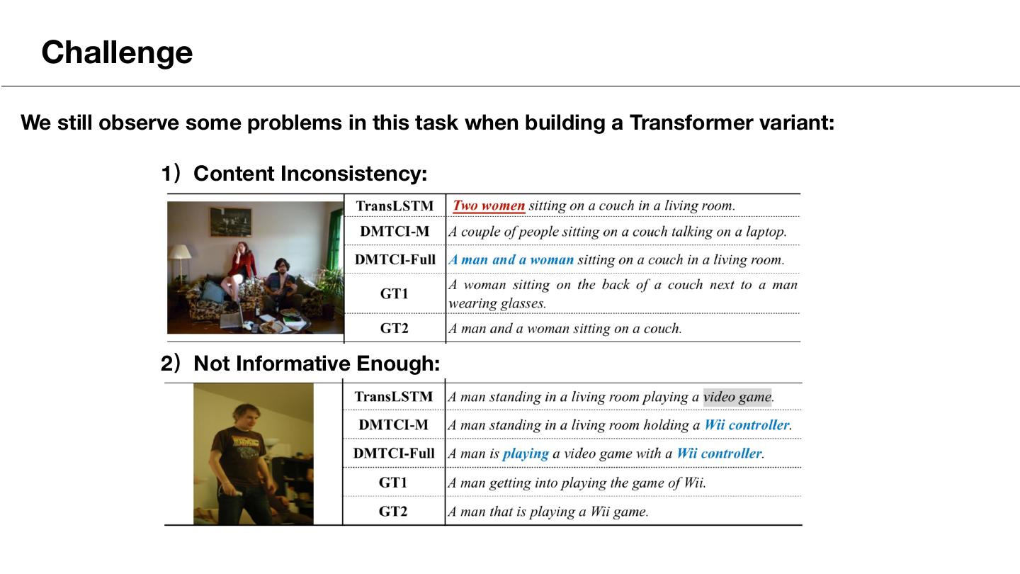 6 . Challenge We still observe some problems in this task when building a Transformer variant: 1)Content Inconsistency: 2)Not Informative Enough: