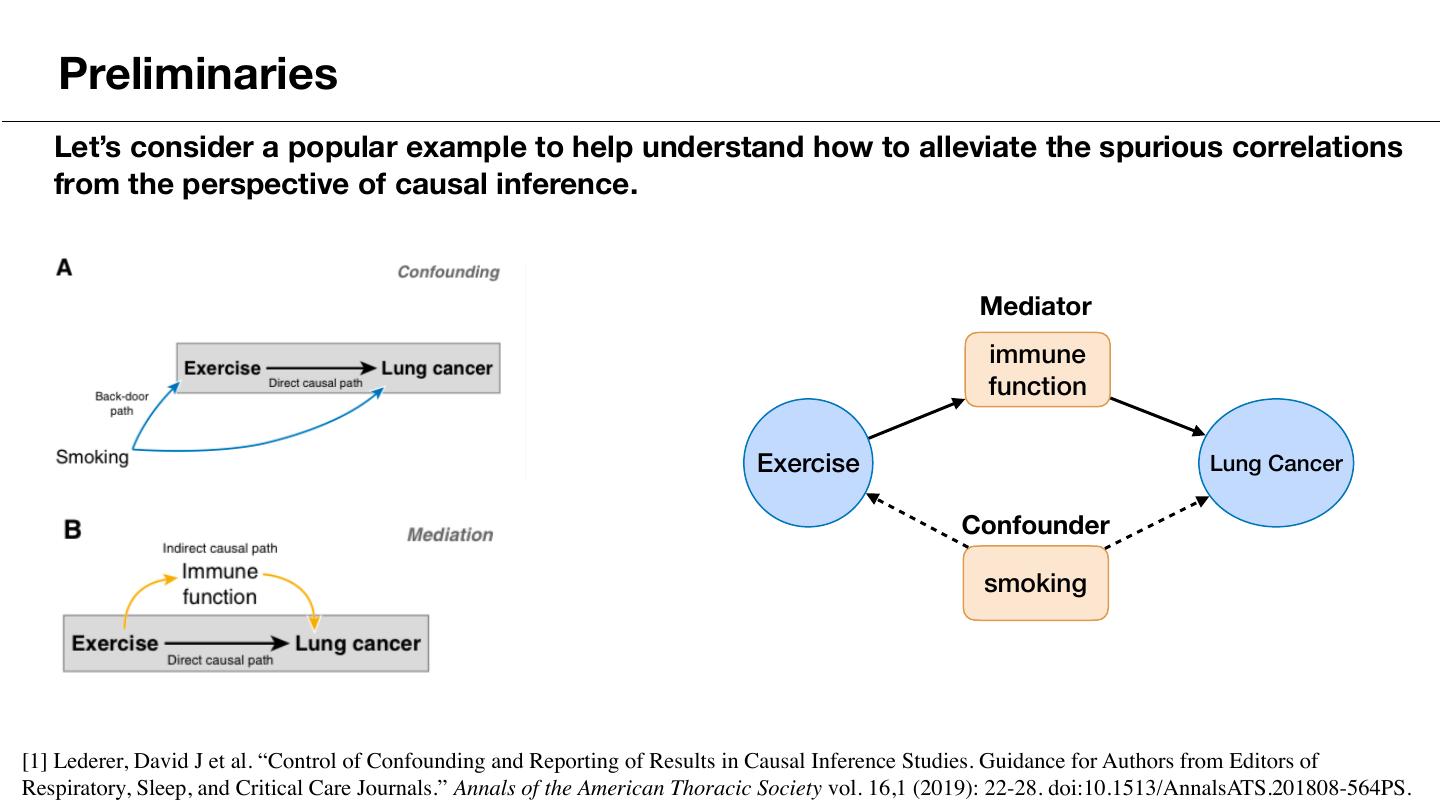 9 . Preliminaries Let’s consider a popular example to help understand how to alleviate the spurious correlations from the perspective of causal inference. Mediator immune function Exercise Lung Cancer Confounder smoking [1] Lederer, David J et al. “Control of Confounding and Reporting of Results in Causal Inference Studies. Guidance for Authors from Editors of Respiratory, Sleep, and Critical Care Journals.” Annals of the American Thoracic Society vol. 16,1 (2019): 22-28. doi:10.1513/AnnalsATS.201808-564PS.