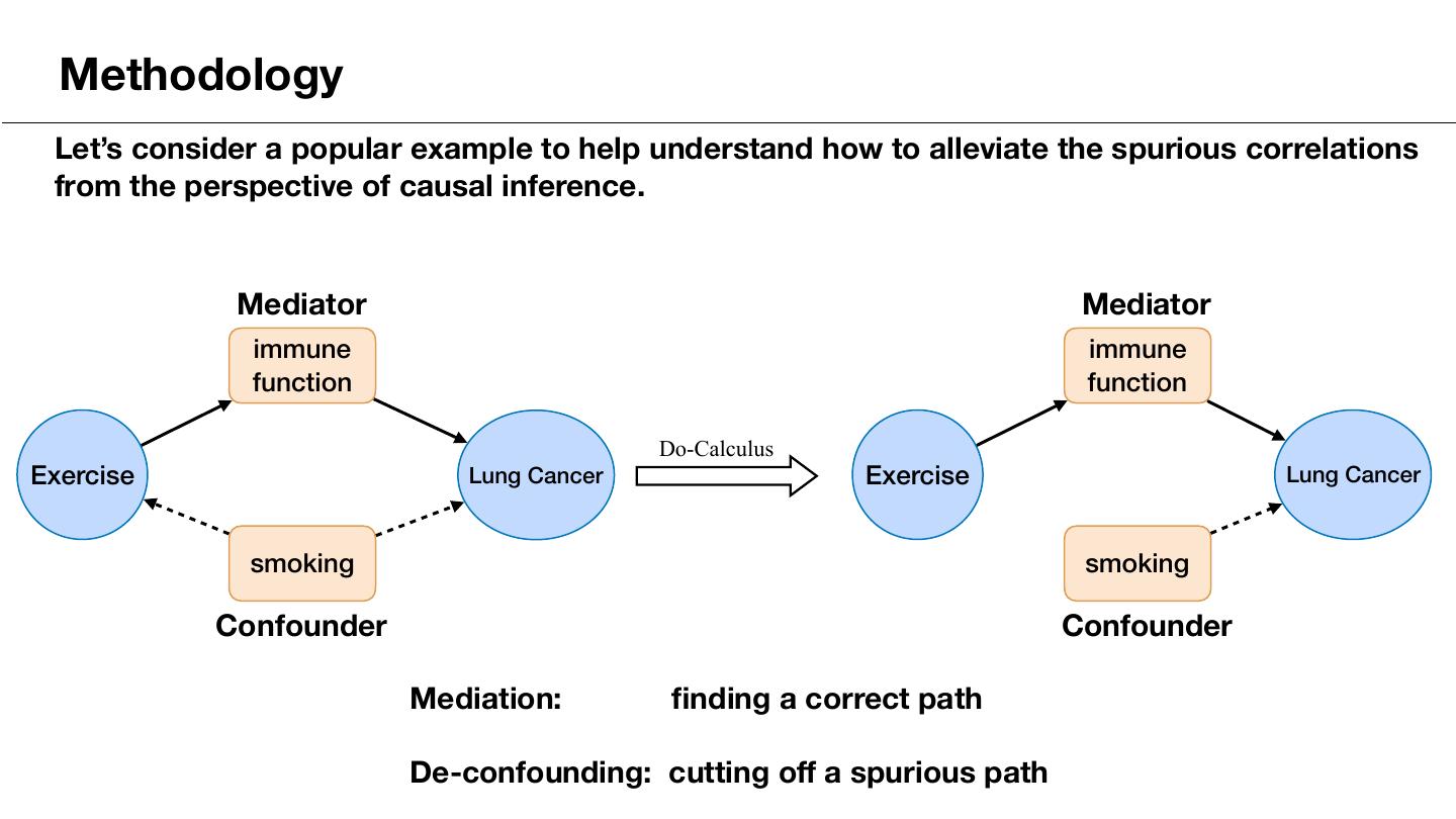 10 . Methodology Let’s consider a popular example to help understand how to alleviate the spurious correlations from the perspective of causal inference. Mediator Mediator immune immune function function Do-Calculus Exercise Lung Cancer Exercise Lung Cancer smoking smoking Confounder Confounder Mediation: finding a correct path De-confounding: cutting off a spurious path