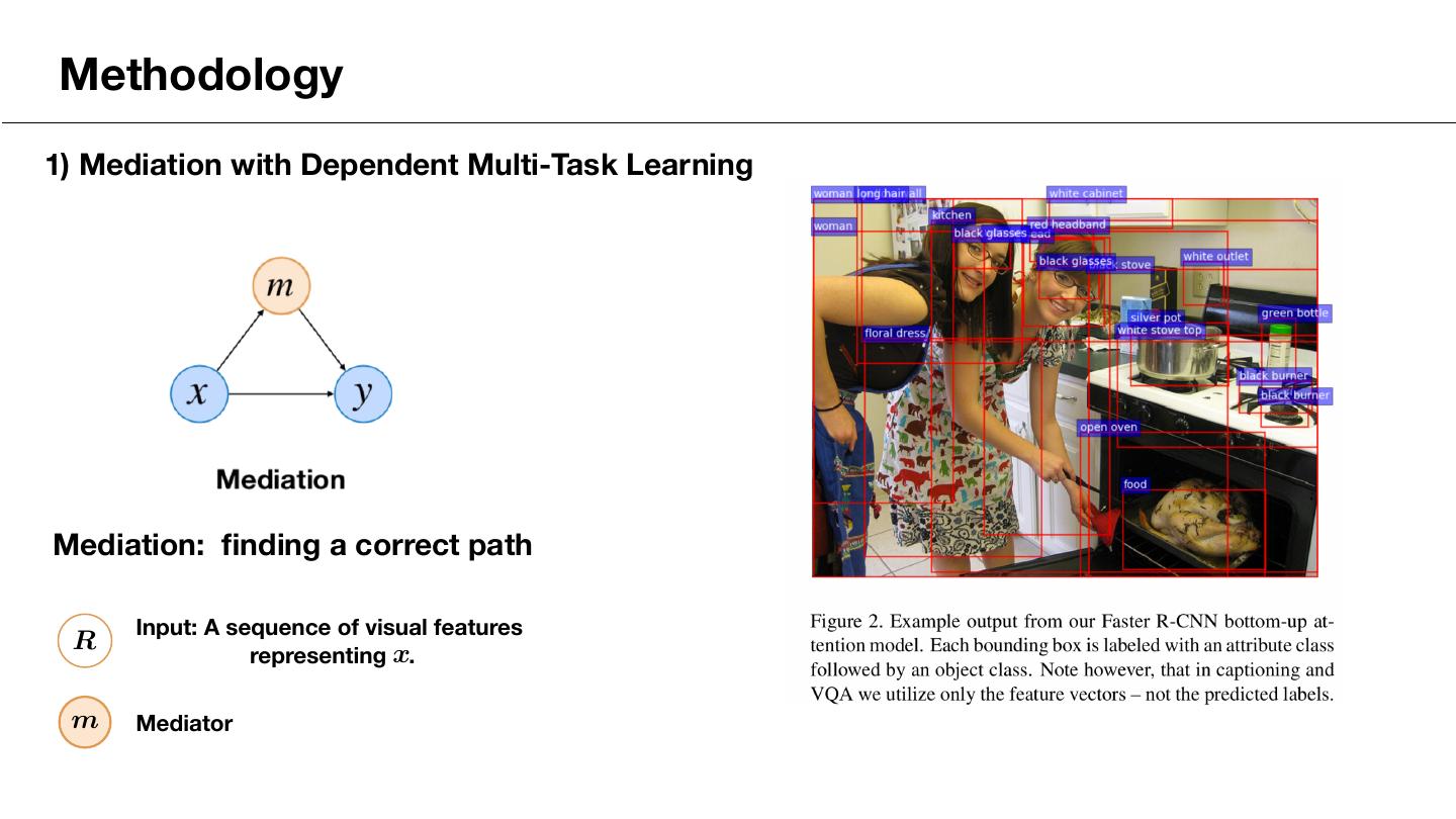 13 .Methodology 1) Mediation with Dependent Multi-Task Learning Democratic MTL Dependent MTL Mediation: finding a correct path Input: A sequence of visual features R <latexit sha1_base64="LDrYFNttM/Qfk5pNSdW/EJ4DhYI=">AAAB9XicbVC7TsMwFL3hWcqrwMhiUSExVQlCwFjBwlgQfUhtqBzHaa06dmQ7oCrqf7AwgBAr/8LG3+C0GaDlSJaPzrlXPj5Bwpk2rvvtLC2vrK6tlzbKm1vbO7uVvf2WlqkitEkkl6oTYE05E7RpmOG0kyiK44DTdjC6zv32I1WaSXFvxgn1YzwQLGIEGys99ALJQz2O7ZXdTfqVqltzp0CLxCtIFQo0+pWvXihJGlNhCMdadz03MX6GlWGE00m5l2qaYDLCA9q1VOCYaj+bpp6gY6uEKJLKHmHQVP29keFY59HsZIzNUM97ufif101NdOlnTCSpoYLMHopSjoxEeQUoZIoSw8eWYKKYzYrIECtMjC2qbEvw5r+8SFqnNe+85t6eVetXRR0lOIQjOAEPLqAON9CAJhBQ8Ayv8OY8OS/Ou/MxG11yip0D+APn8wcbNJLo</latexit> representing x. <latexit sha1_base64="L8I0+8VkoZB8twk/ht5XwWaicL4=">AAAB9XicbVC7TsMwFL3hWcqrwMhiUSExVQlCwFjBwlgk+pDaUDmO01p17Mh2gCrqf7AwgBAr/8LG3+C0GaDlSJaPzrlXPj5Bwpk2rvvtLC2vrK6tlzbKm1vbO7uVvf2WlqkitEkkl6oTYE05E7RpmOG0kyiK44DTdjC6zv32A1WaSXFnxgn1YzwQLGIEGyvd9wLJQz2O7ZU9TfqVqltzp0CLxCtIFQo0+pWvXihJGlNhCMdadz03MX6GlWGE00m5l2qaYDLCA9q1VOCYaj+bpp6gY6uEKJLKHmHQVP29keFY59HsZIzNUM97ufif101NdOlnTCSpoYLMHopSjoxEeQUoZIoSw8eWYKKYzYrIECtMjC2qbEvw5r+8SFqnNe+85t6eVetXRR0lOIQjOAEPLqAON9CAJhBQ8Ayv8OY8Oi/Ou/MxG11yip0D+APn8wdU8pMO</latexit> Mediation with Dependent MTL m <latexit sha1_base64="oBnwf4KvSDL5cUzi3dFystIxSu0=">AAAB9XicbVDLSgMxFL1TX7W+qi7dBIvgqsyIqMuiG5cV7APasWQymTY0mQxJRilD/8ONC0Xc+i/u/Bsz7Sy09UDI4Zx7yckJEs60cd1vp7Syura+Ud6sbG3v7O5V9w/aWqaK0BaRXKpugDXlLKYtwwyn3URRLAJOO8H4Jvc7j1RpJuN7M0moL/AwZhEj2FjpoR9IHuqJsFcmpoNqza27M6Bl4hWkBgWag+pXP5QkFTQ2hGOte56bGD/DyjDC6bTSTzVNMBnjIe1ZGmNBtZ/NUk/RiVVCFEllT2zQTP29kWGh82h2UmAz0oteLv7n9VITXfkZi5PU0JjMH4pSjoxEeQUoZIoSwyeWYKKYzYrICCtMjC2qYkvwFr+8TNpnde+i7t6d1xrXRR1lOIJjOAUPLqEBt9CEFhBQ8Ayv8OY8OS/Ou/MxHy05xc4h/IHz+QNEO5MD</latexit> Mediator The choice of mediators: bag of categories.