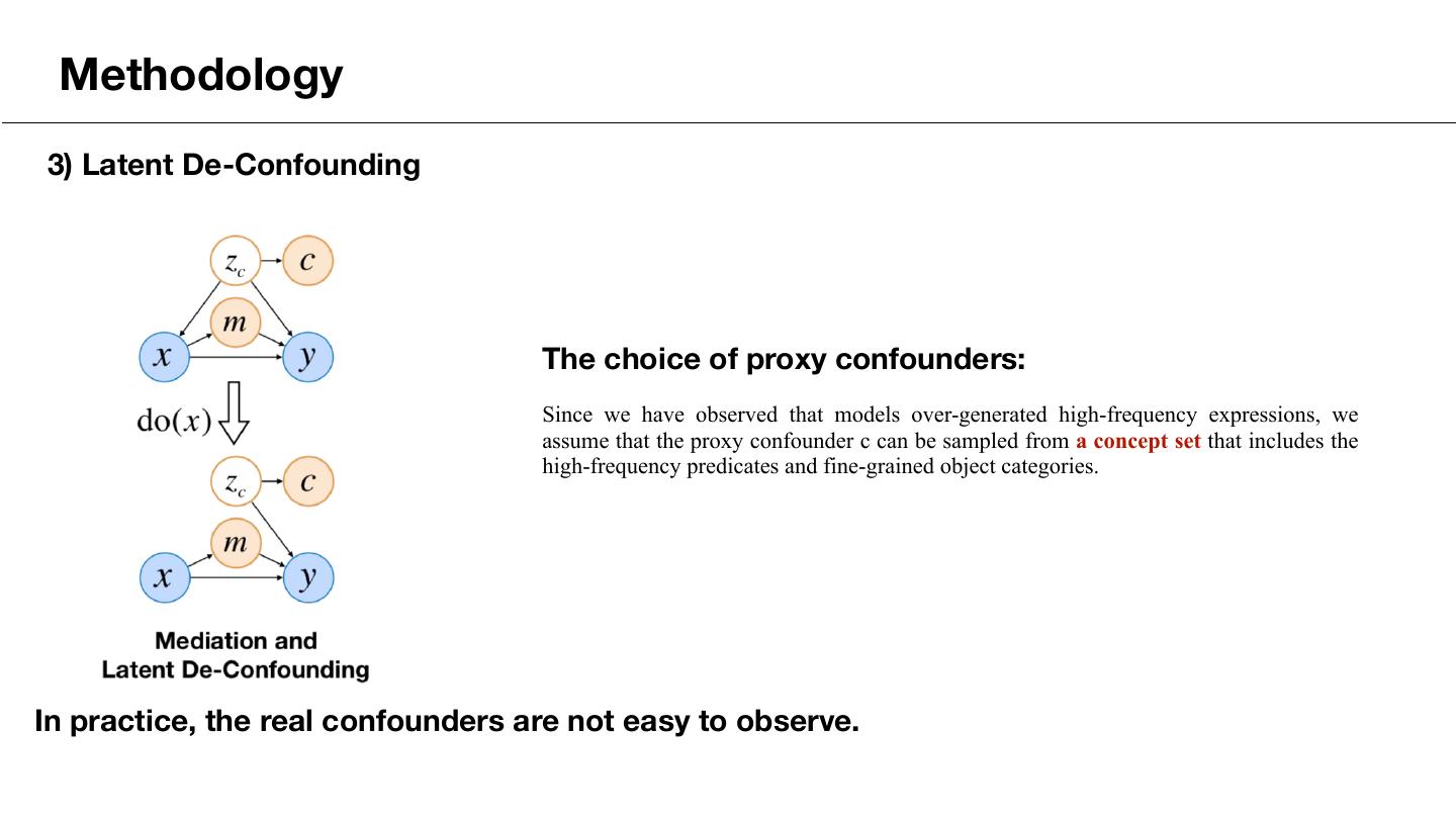 17 . Methodology 3) Latent De-Confounding The choice of proxy confounders: Since we have observed that models over-generated high-frequency expressions, we assume that the proxy confounder c can be sampled from a concept set that includes the high-frequency predicates and fine-grained object categories. In practice, the real confounders are not easy to observe.