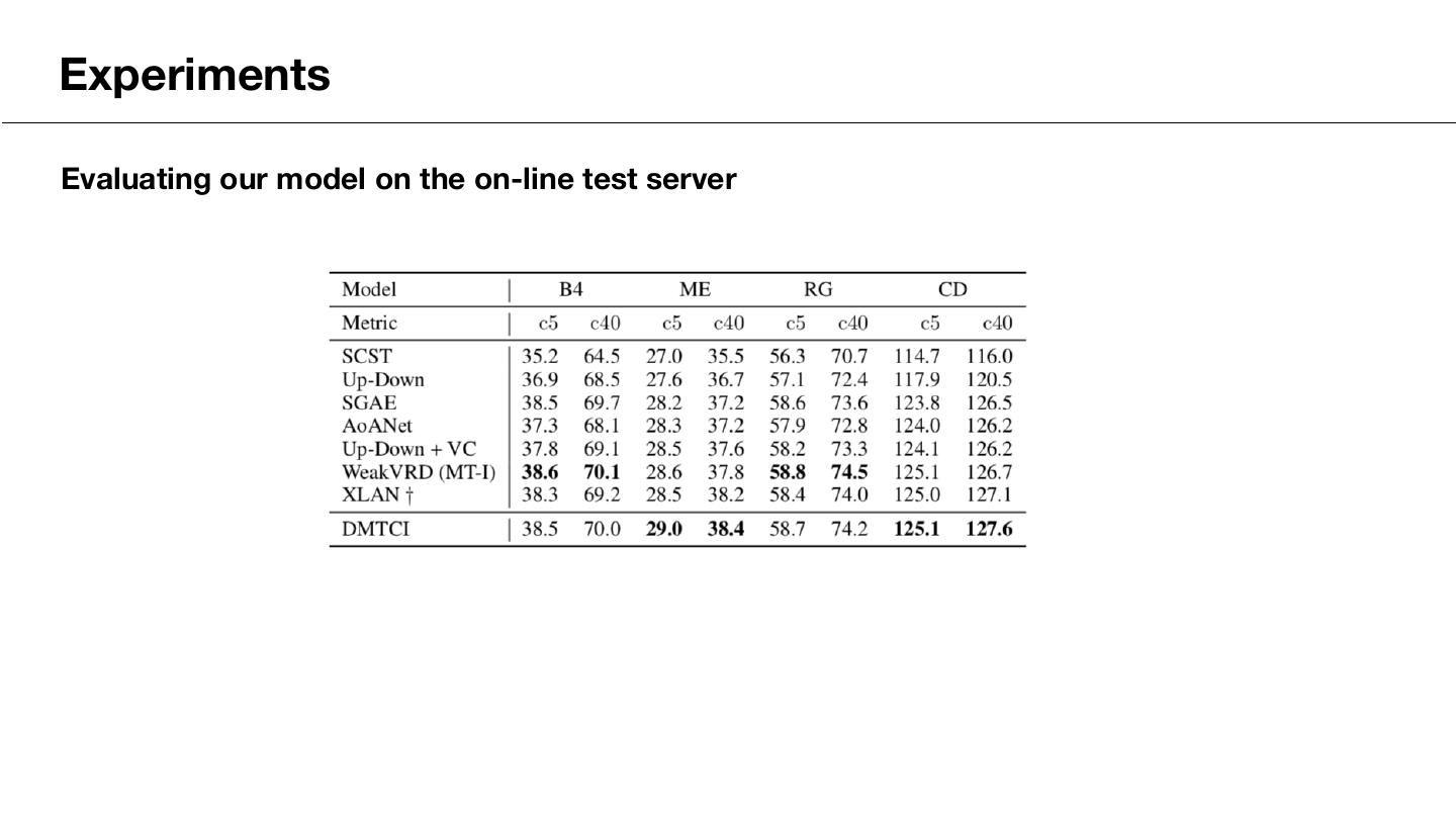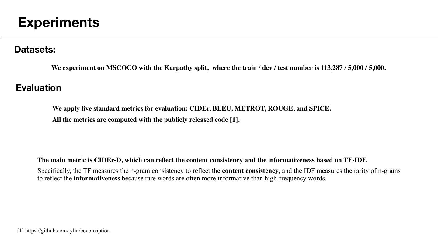 20 .Experiments Datasets: We experiment on MSCOCO with the Karpathy split, where the train / dev / test number is 113,287 / 5,000 / 5,000. Evaluation We apply five standard metrics for evaluation: CIDEr, BLEU, METROT, ROUGE, and SPICE. All the metrics are computed with the publicly released code [1]. The main metric is CIDEr-D, which can reflect the content consistency and the informativeness based on TF-IDF. Specifically, the TF measures the n-gram consistency to reflect the content consistency, and the IDF measures the rarity of n-grams to reflect the informativeness because rare words are often more informative than high-frequency words. [1] https://github.com/tylin/coco-caption