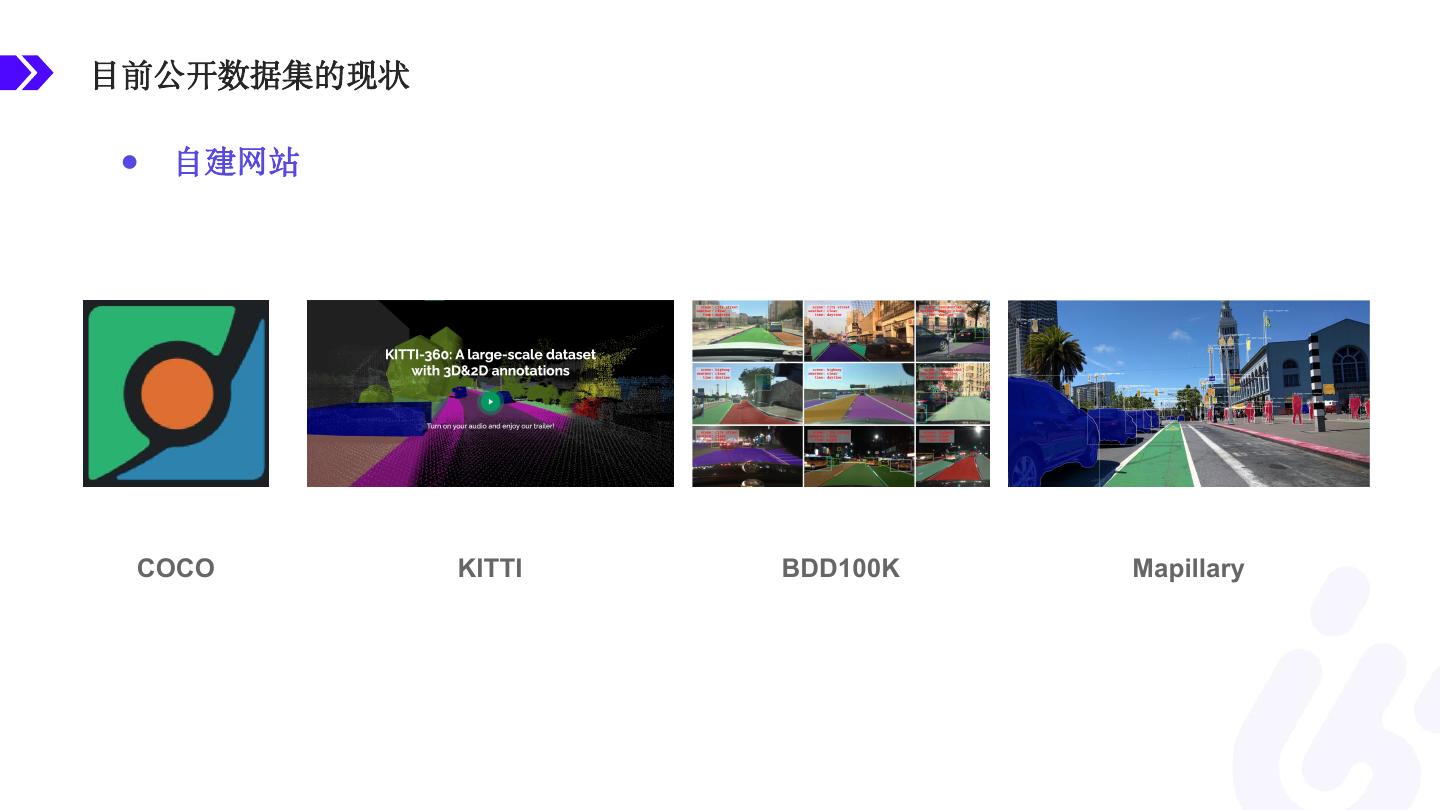 5 .目前公开数据集的现状 ● 自建网站 COCO KITTI BDD100K Mapillary