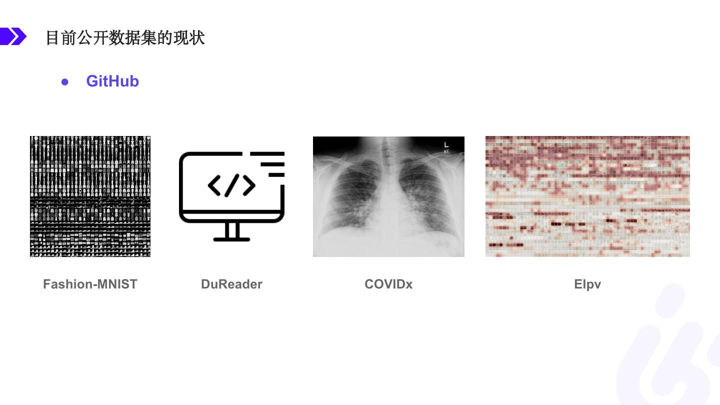 8 .目前公开数据集的现状 ● GitHub Fashion-MNIST DuReader COVIDx Elpv