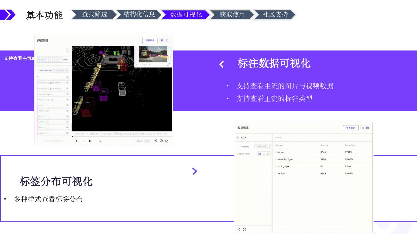 21 .基本功能 查找筛选 结构化信息 数据可视化 获取使用 社区支持 Fork - 获取数据集 Open Datasets TensorBay 统一数据结构调用代码,无需担心数据格式转换